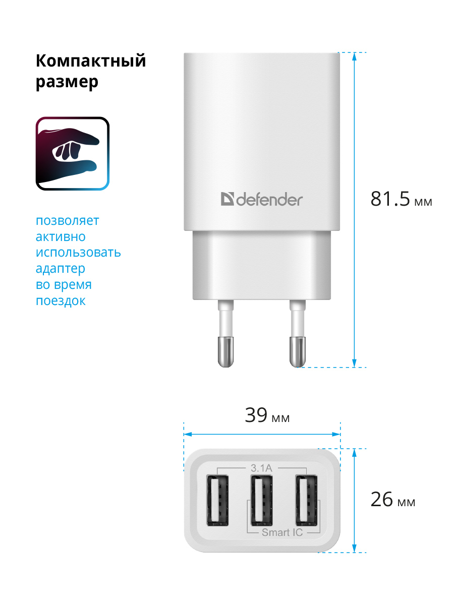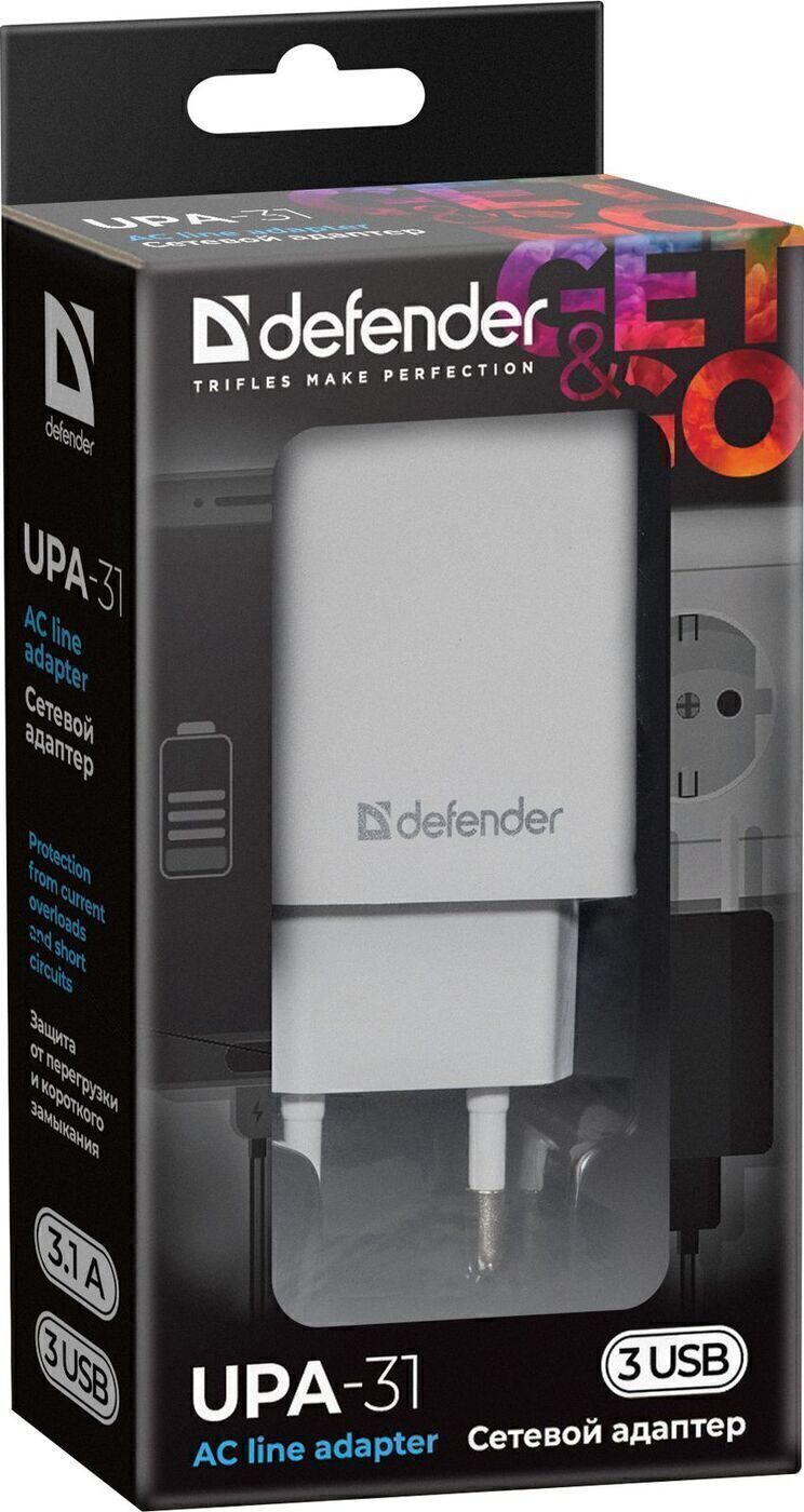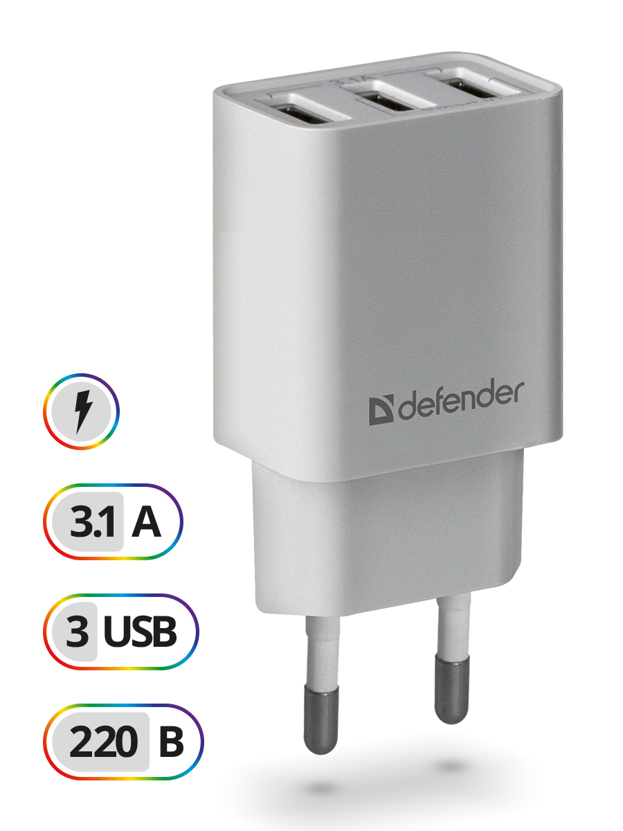 Сетевое зарядное устройство Defender UPA-3 зарядка для телефона на 3xUSB, 5V/3.1А, белый