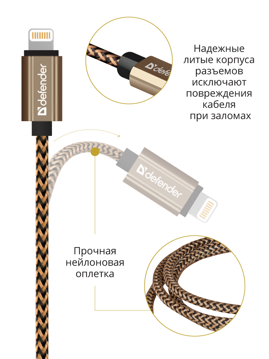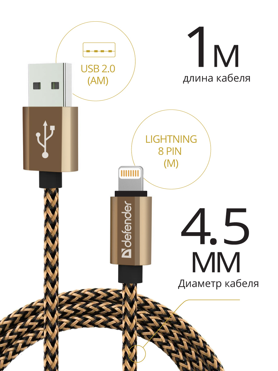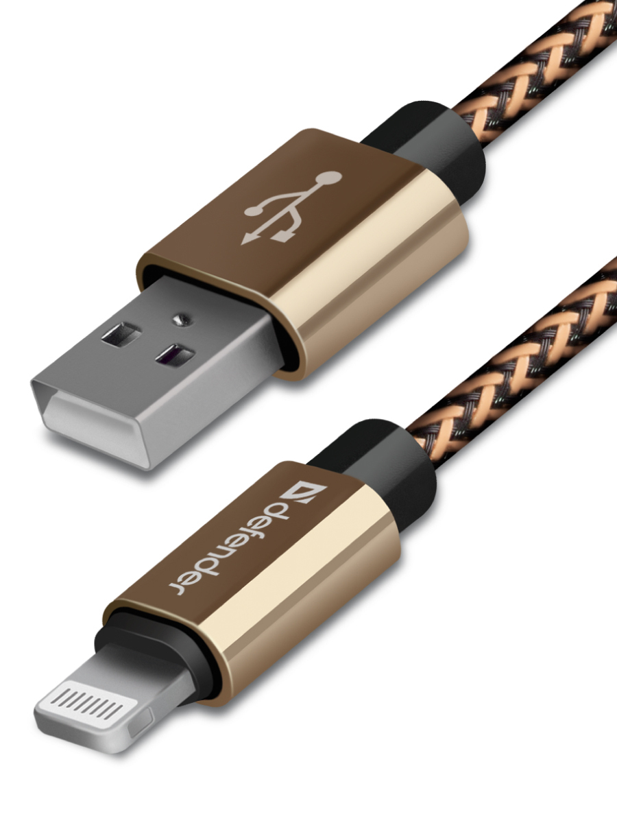 Кабель для зарядки телефона Defender Lightning USB для iPhone, Apple, PRO 2.1A, 1 метр, золотой