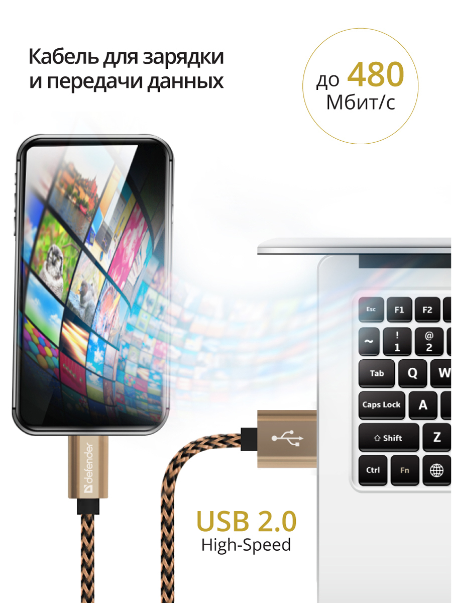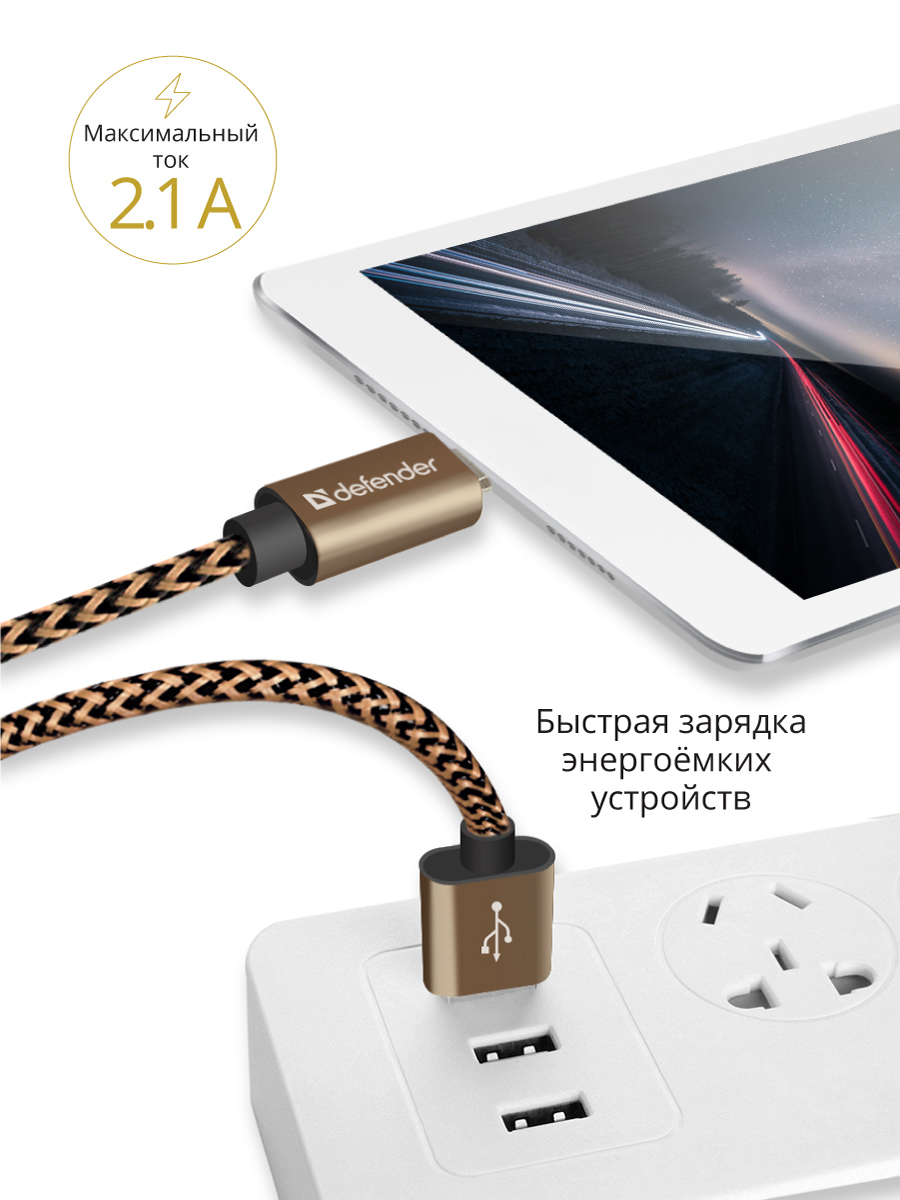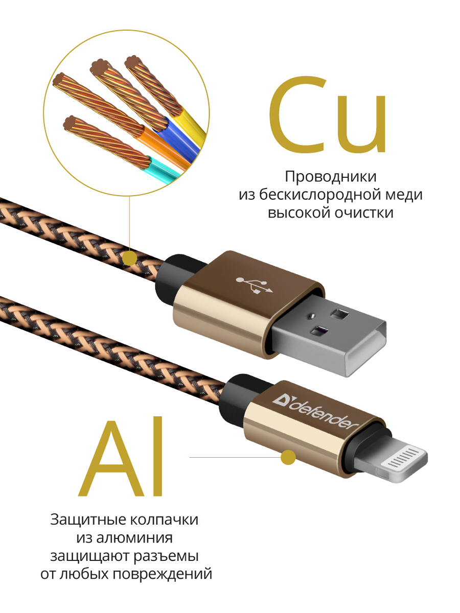 Кабель для зарядки телефона Defender Lightning USB для iPhone, Apple, PRO 2.1A, 1 метр, золотой