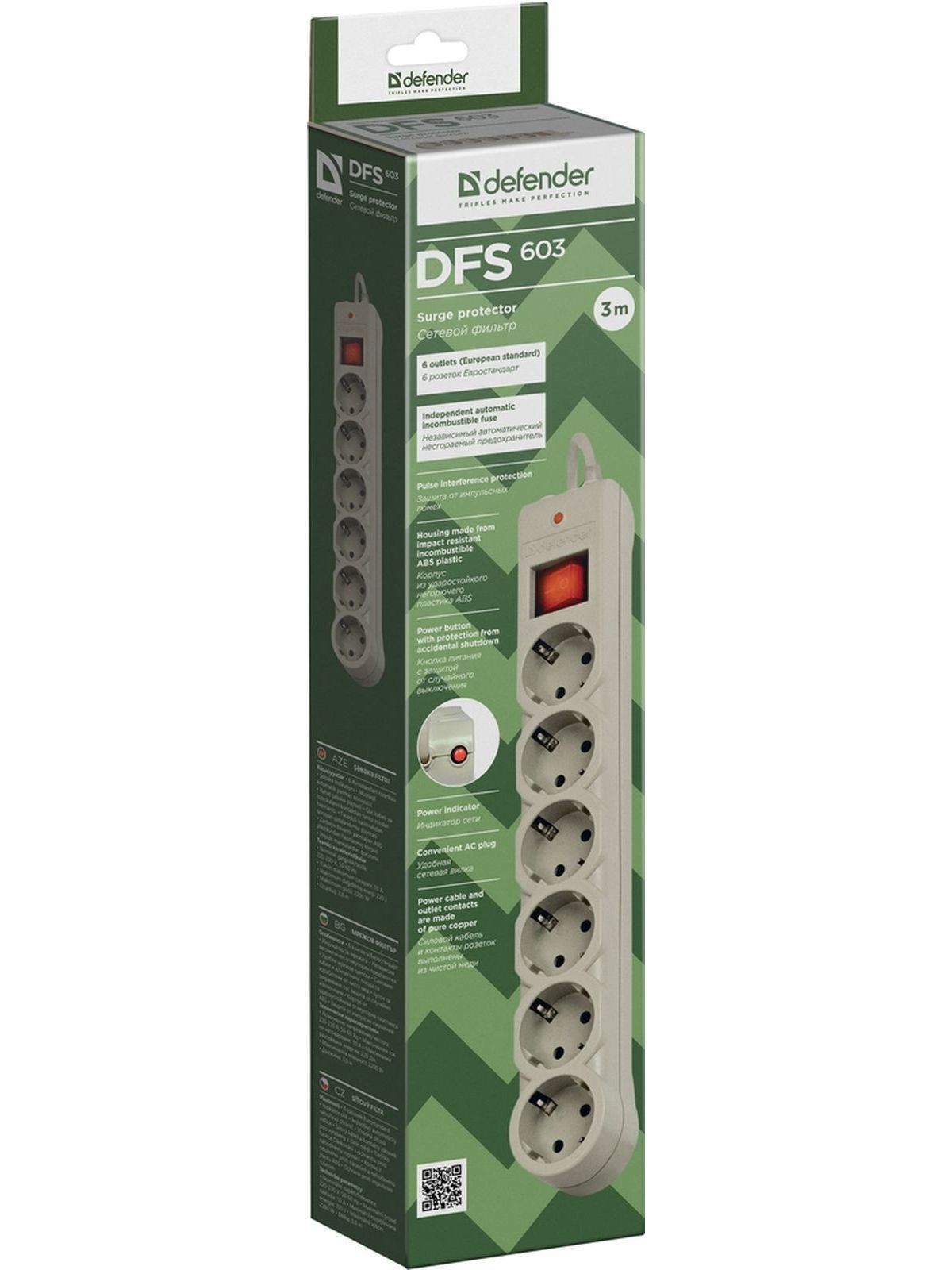 Сетевой фильтр-удлинитель Defender 6 розеток с заземлением , 3 метра , бежевый