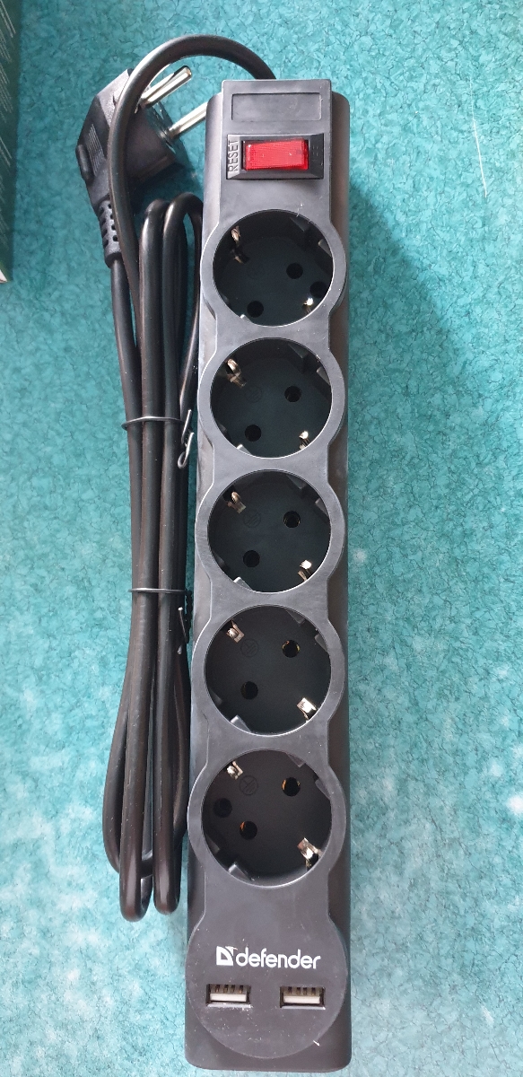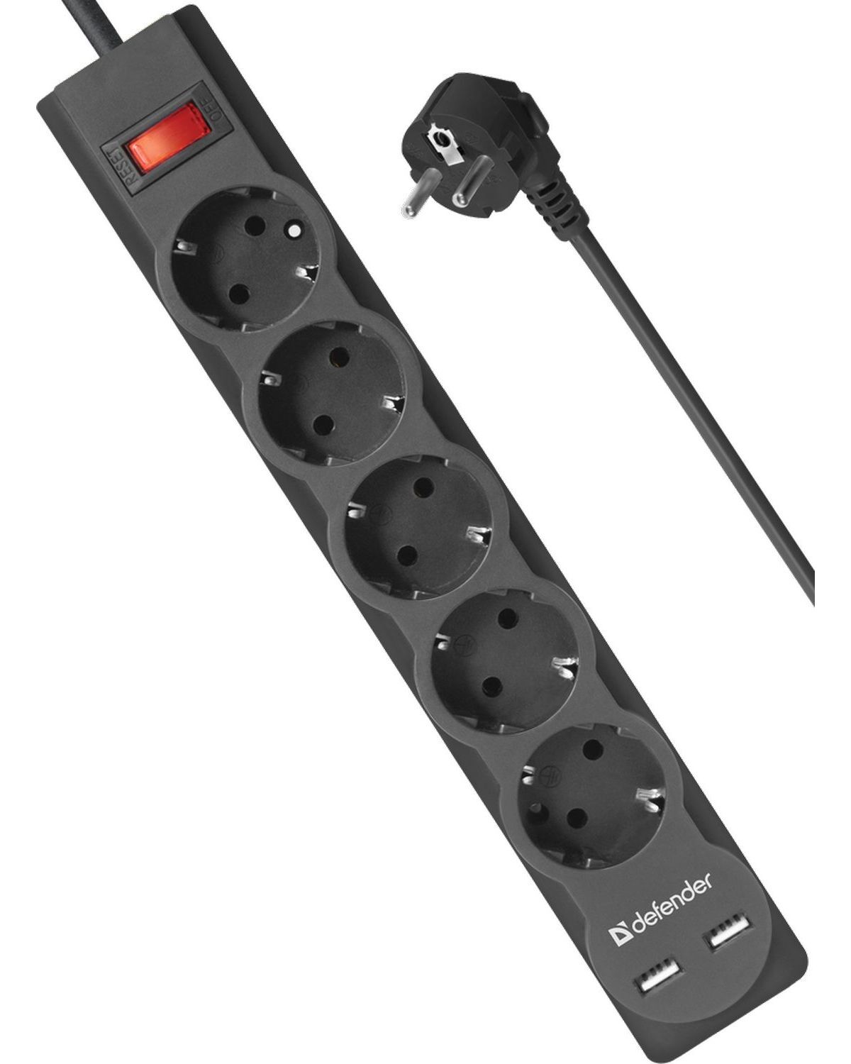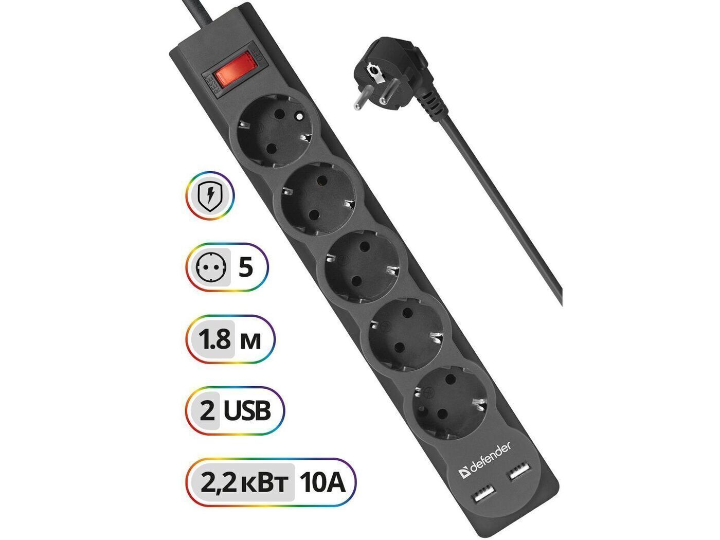 Сетевой фильтр-удлинитель Defender 5 розеток, 1.8 метра , с выключателем, с заземлением, черный