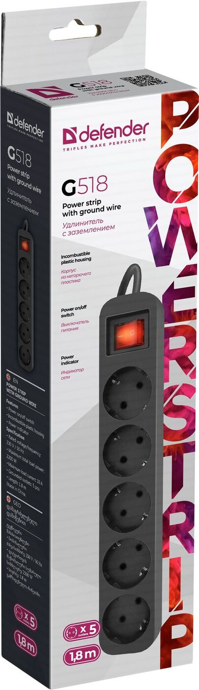 Удлинитель сетевой Defender G518, 5 розеток с заземлением,1.8 метра, выключатель, черный