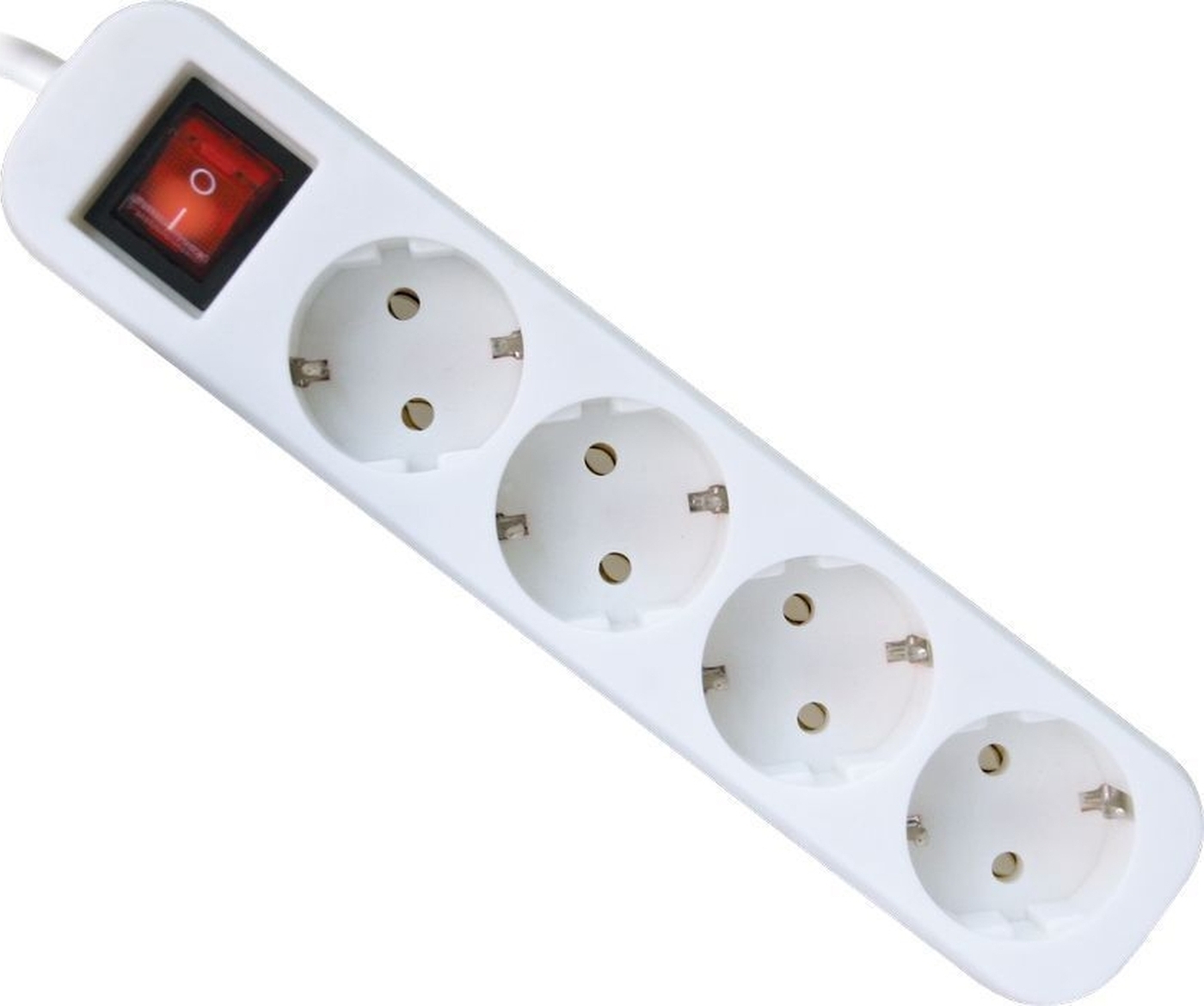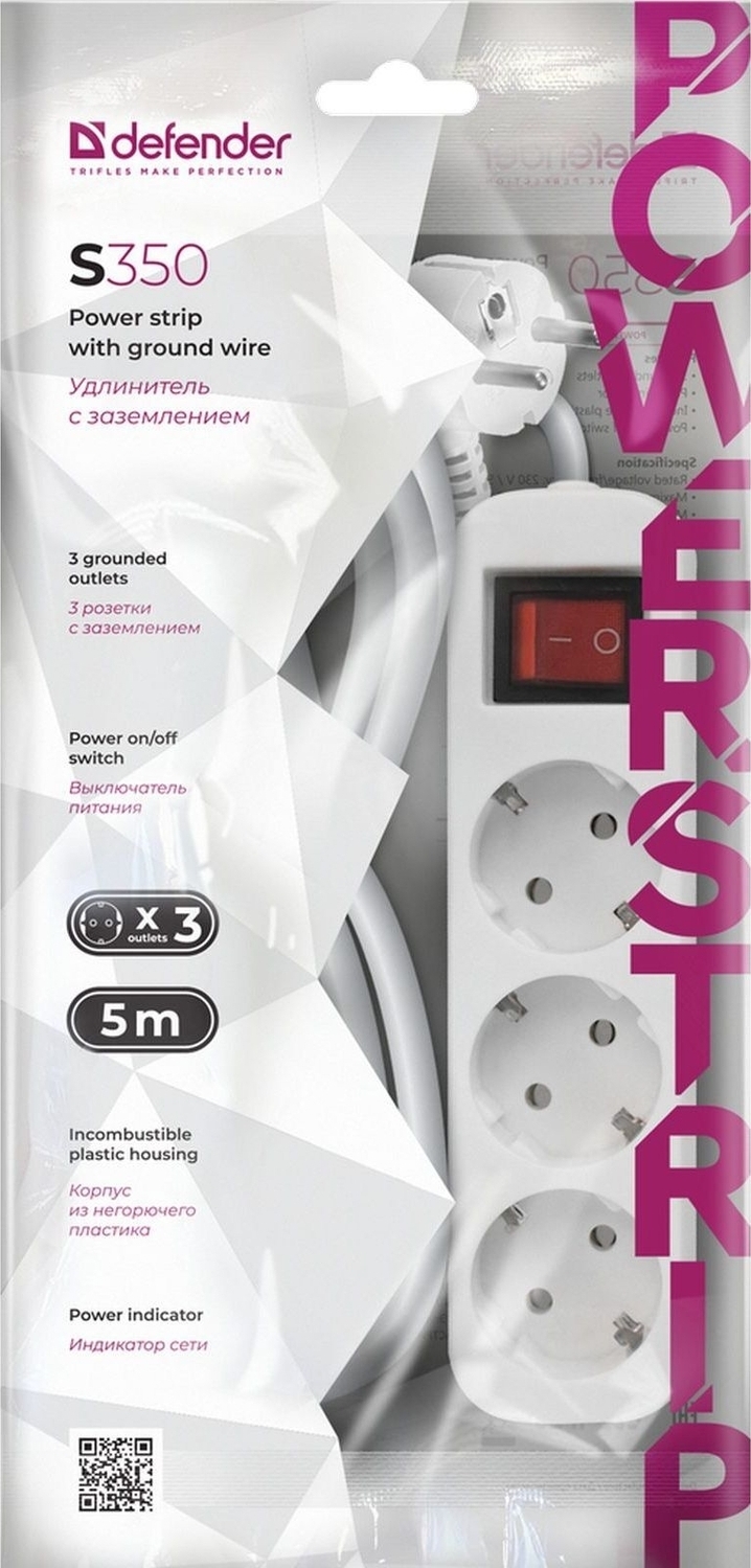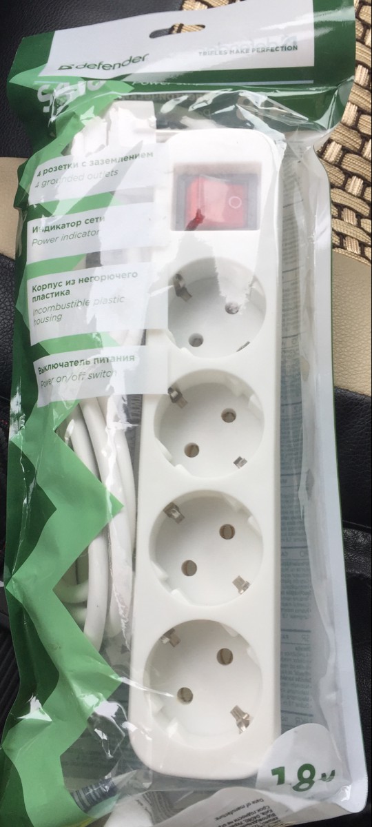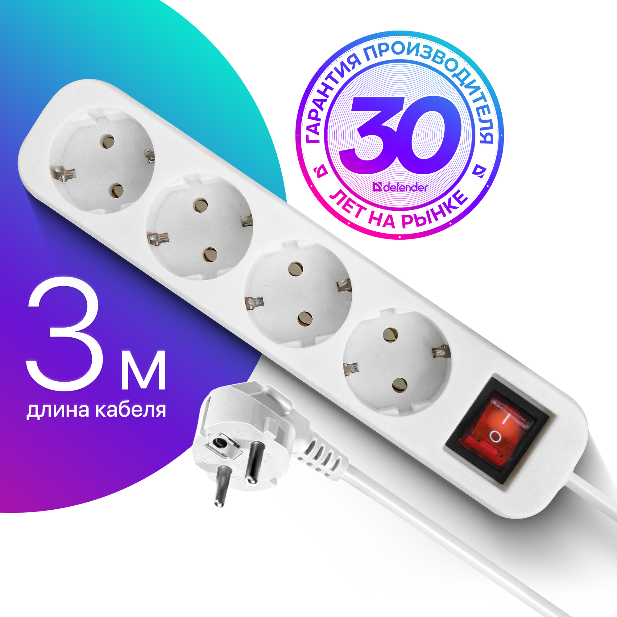 Удлинитель сетевой Defender 4 розетки с заземлением , 3 метра , выключатель
