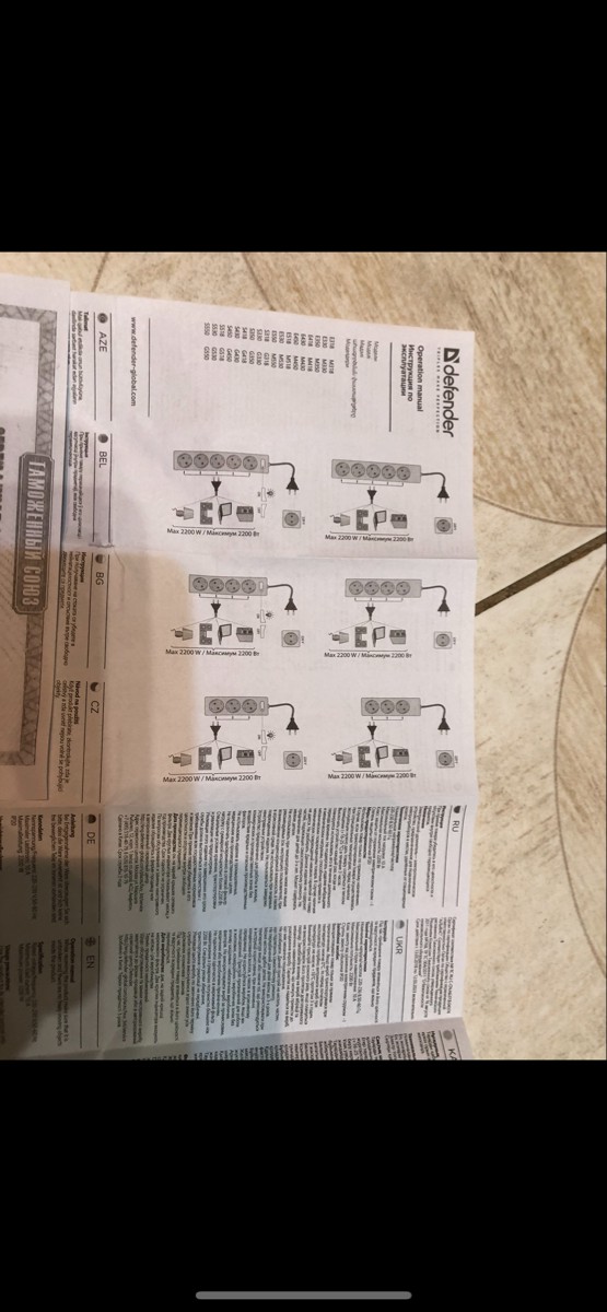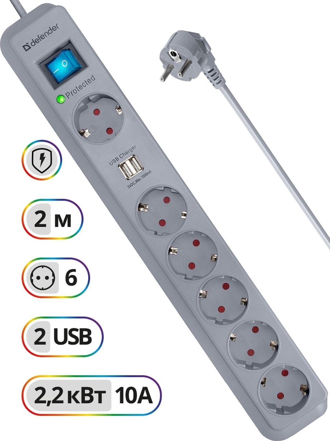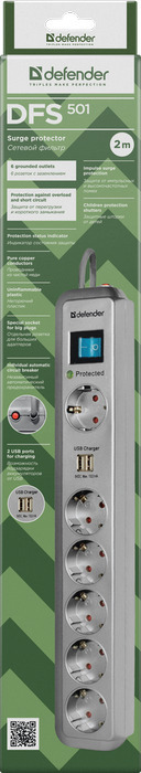 Сетевой фильтр Defender DFS 501, 6 розеток, 2xUSB Type-A, 10 А, 1.8 м, серый