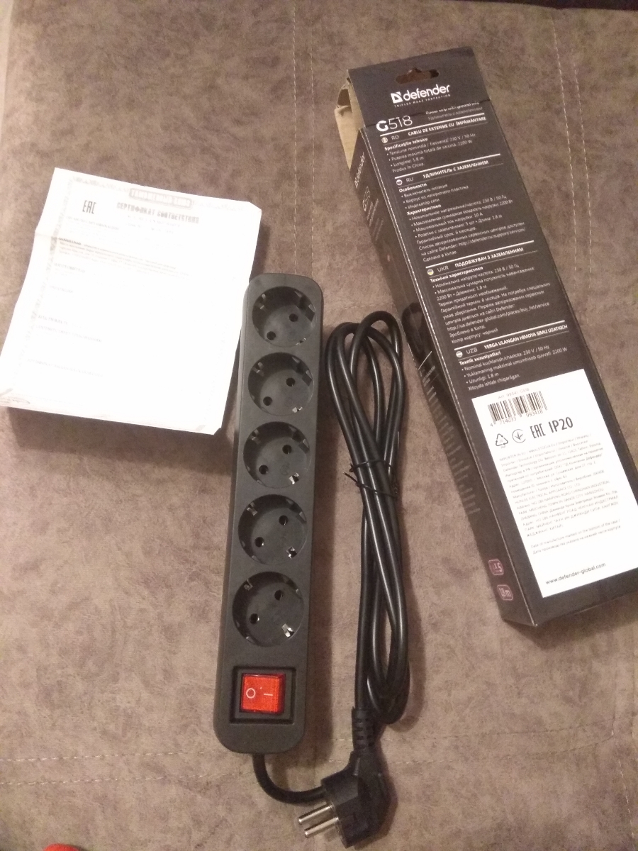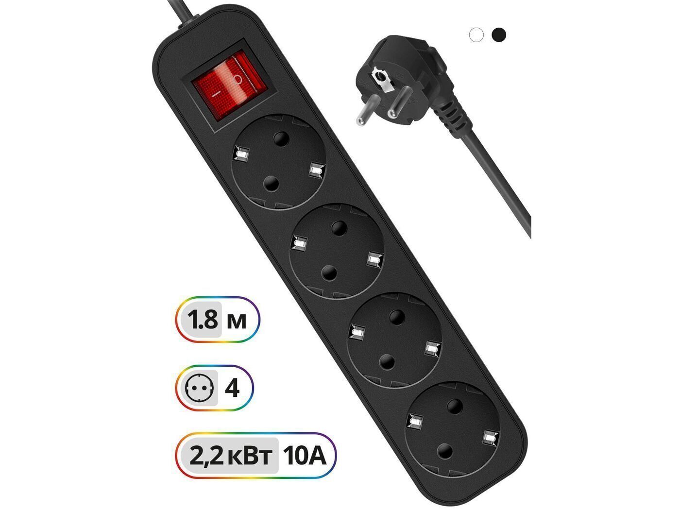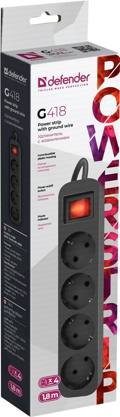 Удлинитель сетевой Defender G418, 4 розетки с заземлением, 1.8 метра, выключатель, черный