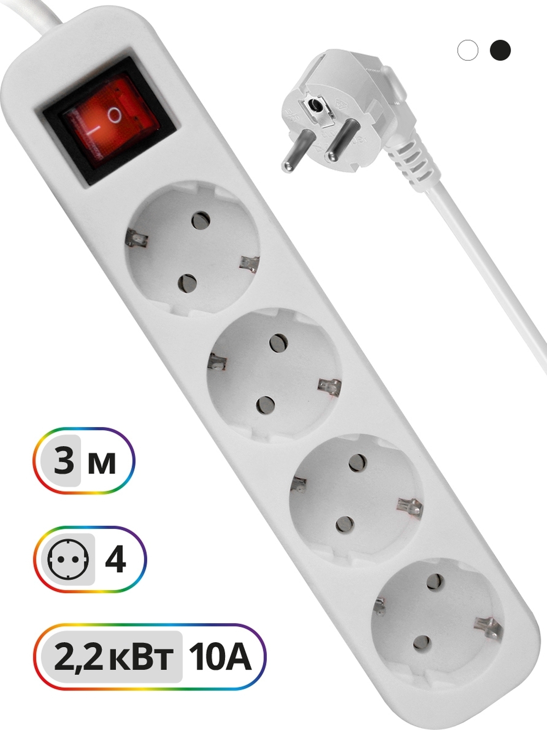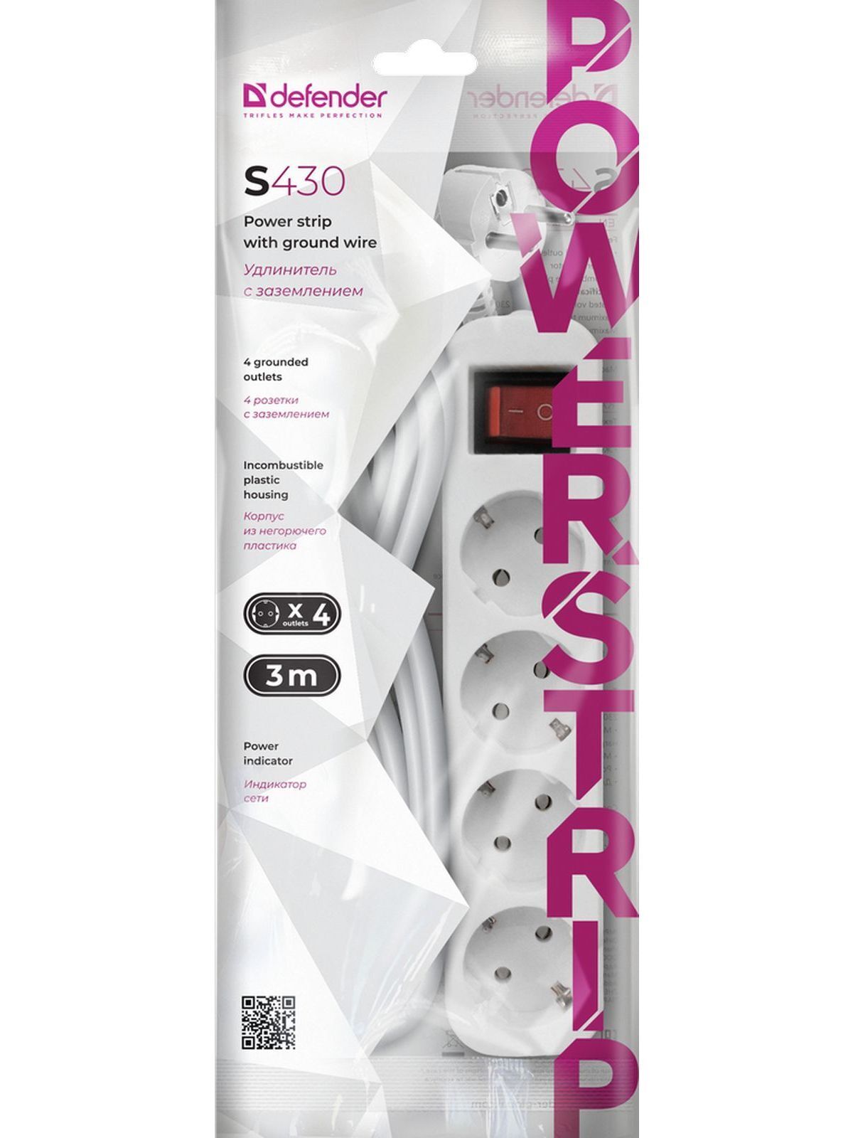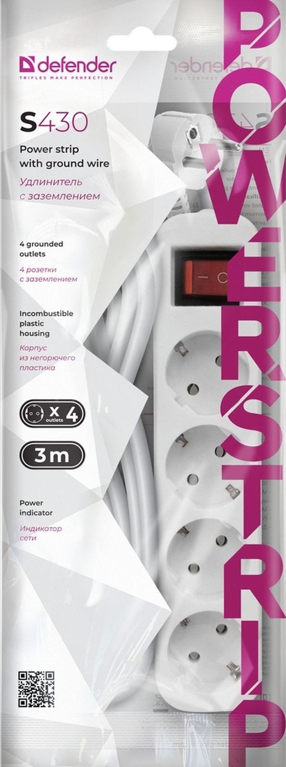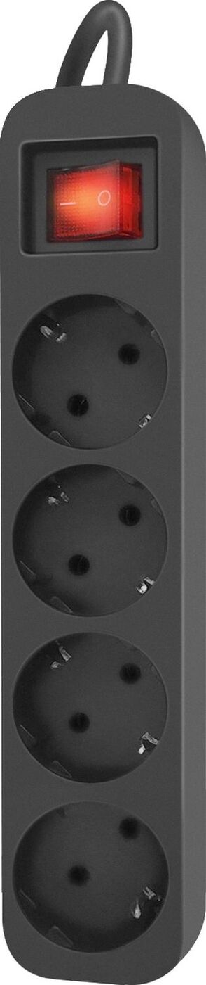 Удлинитель сетевой Defender G430, 4 розетки с заземлением, 3 метра, выключатель, черный
