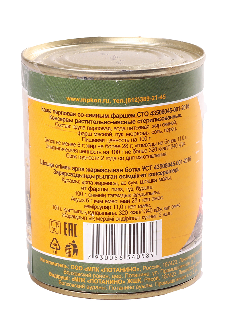 Каша перловая со свининой " Сельская " СТО 340гр. (4шт)
