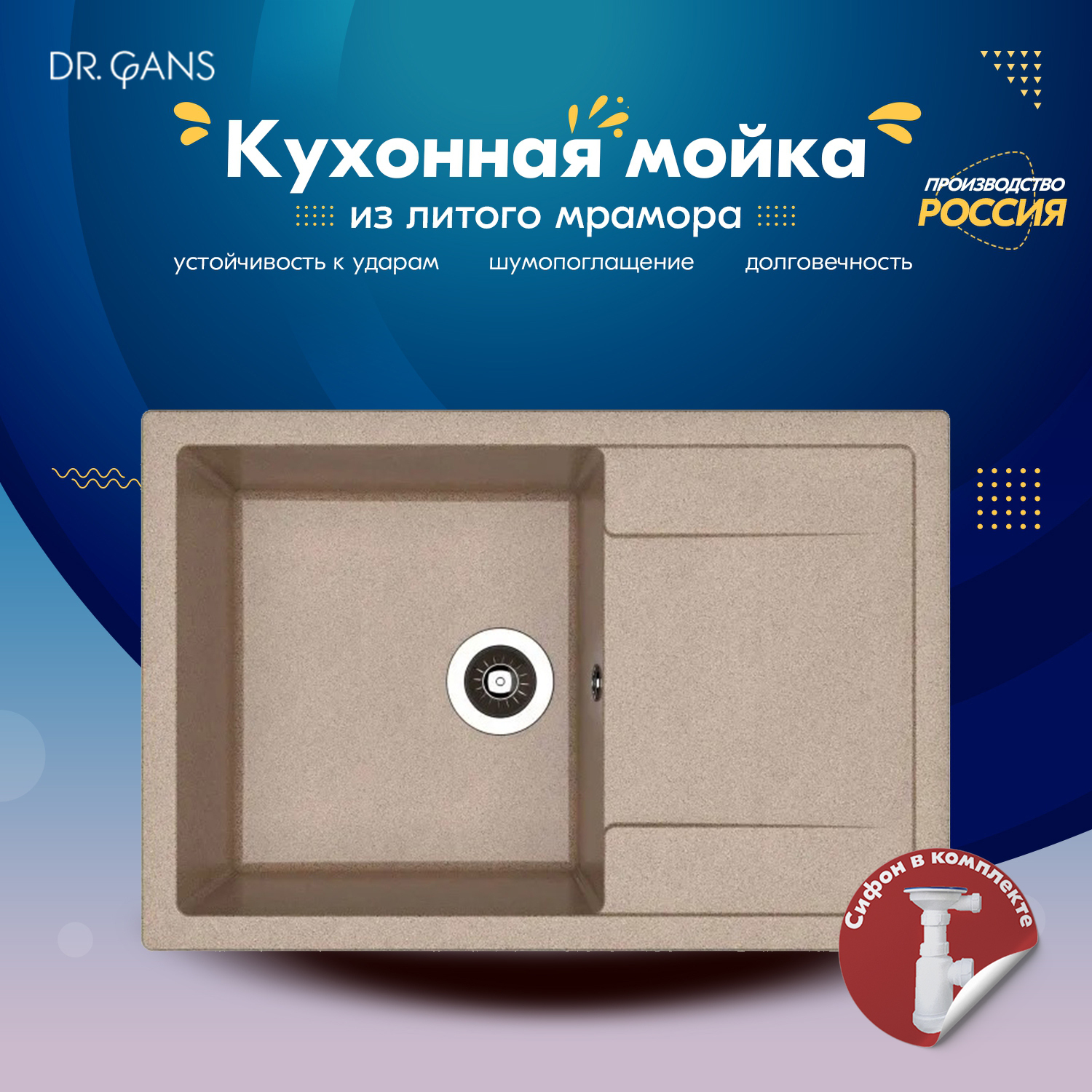 Каменная мойка для кухни врезная Dr. Gans ТЕХНО-860, цвет терра, 860х510х200 мм / раковина для кухни