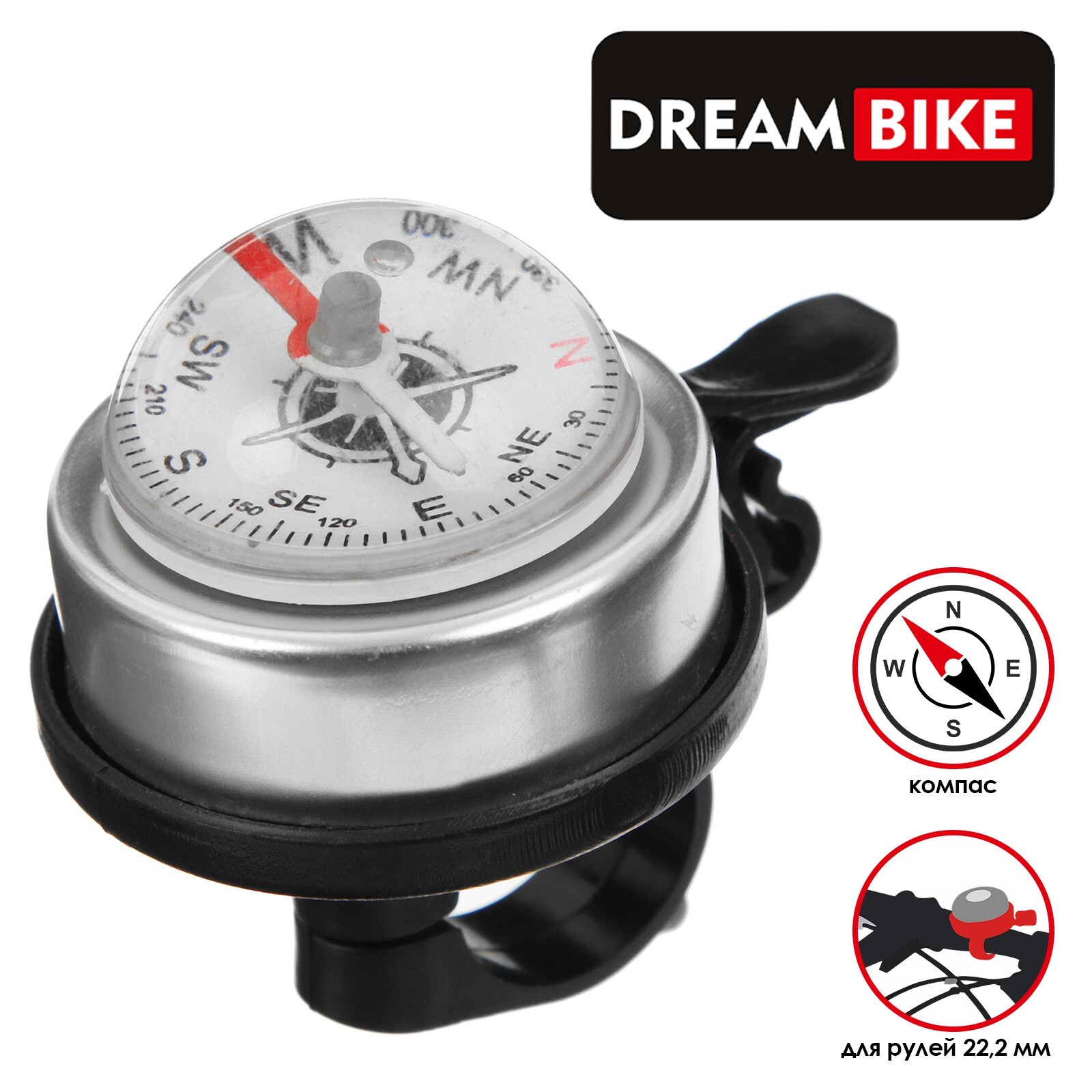 Звонок с компасом Dream Bike, цвет черный, серебристый