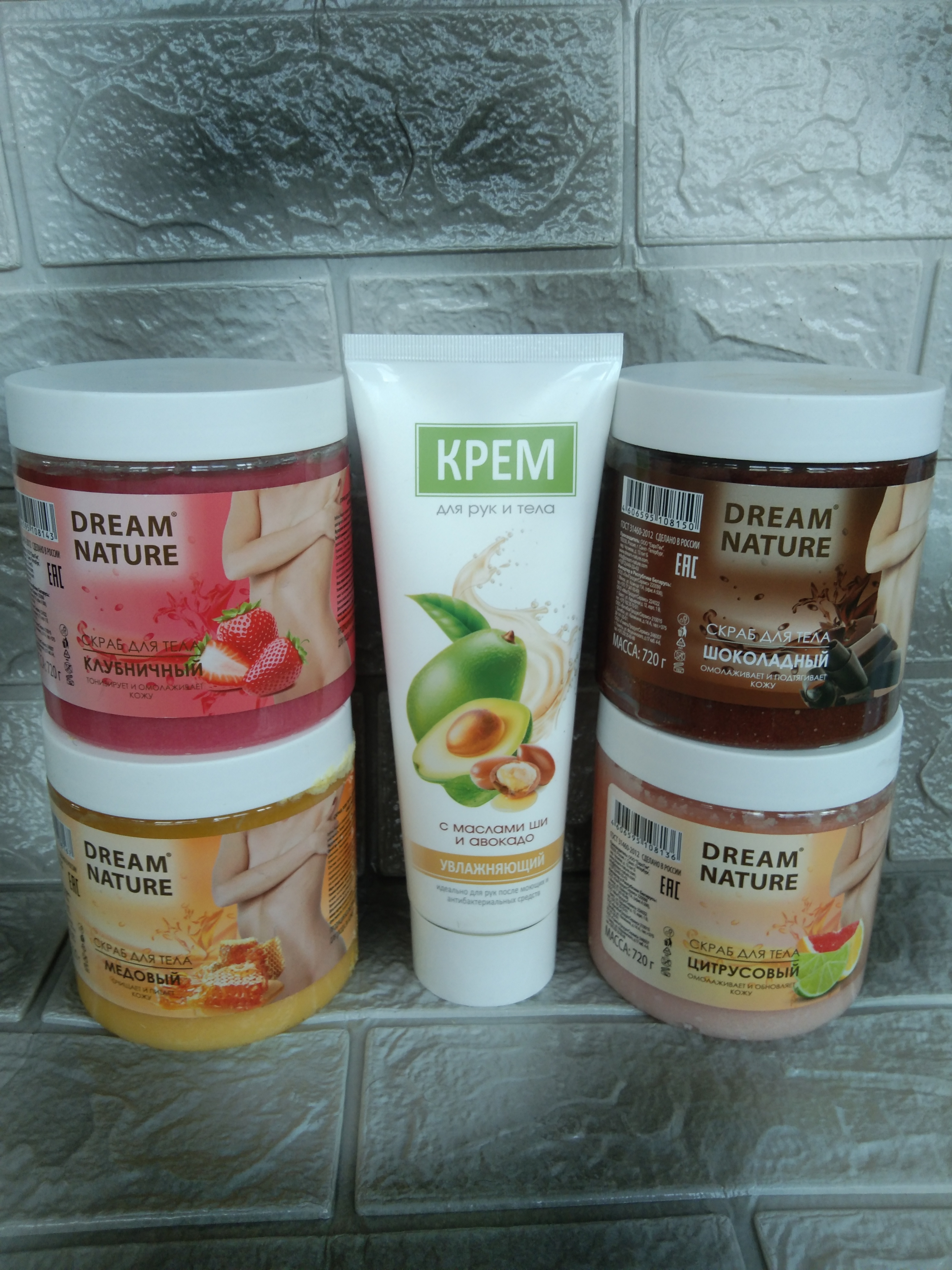 Набор из 4 скрабов для пилинга тела разных ароматов + крем для рук и тела в подарок"