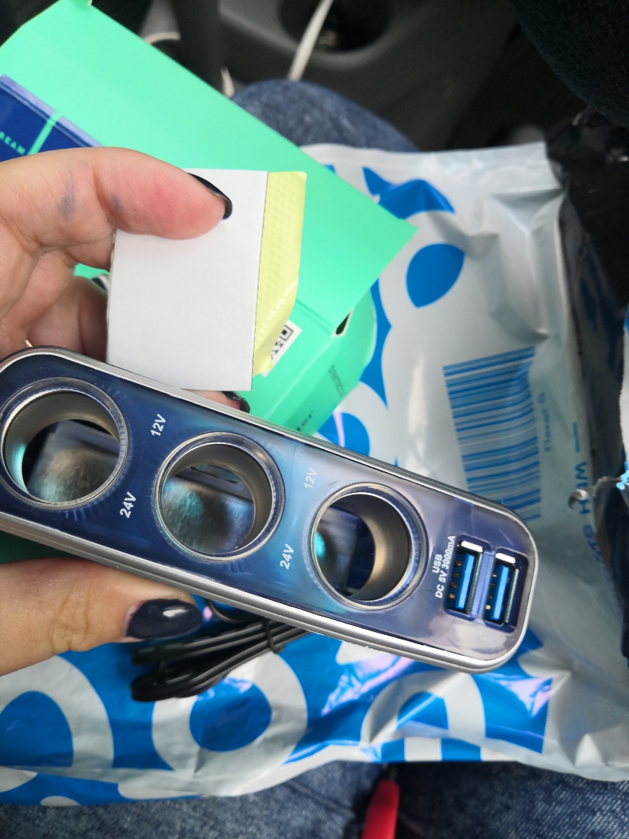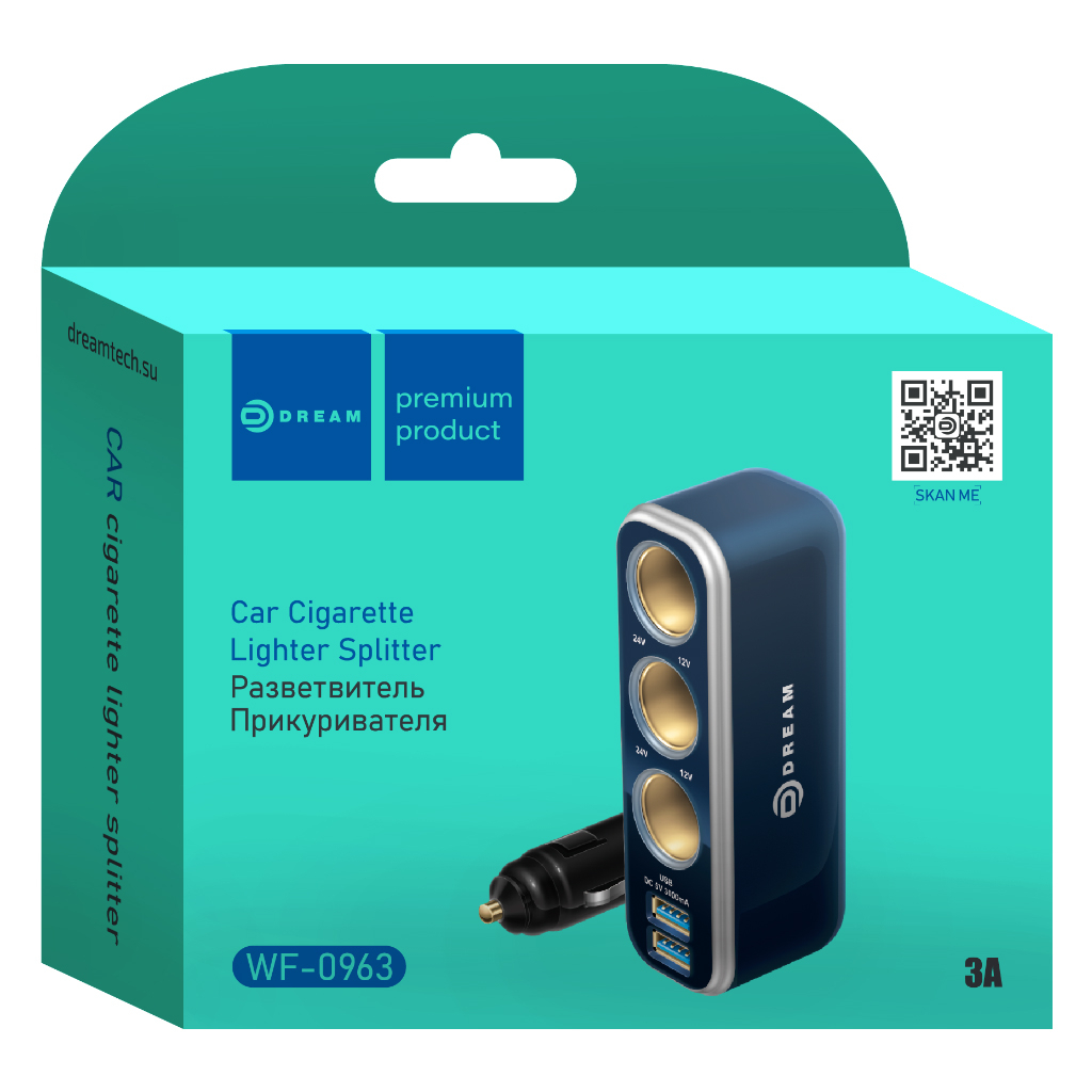 Разветвитель прикуривателя (3A, 0.6M, 3 гнезда, 2USB) DREAM tech WF-0963, черный