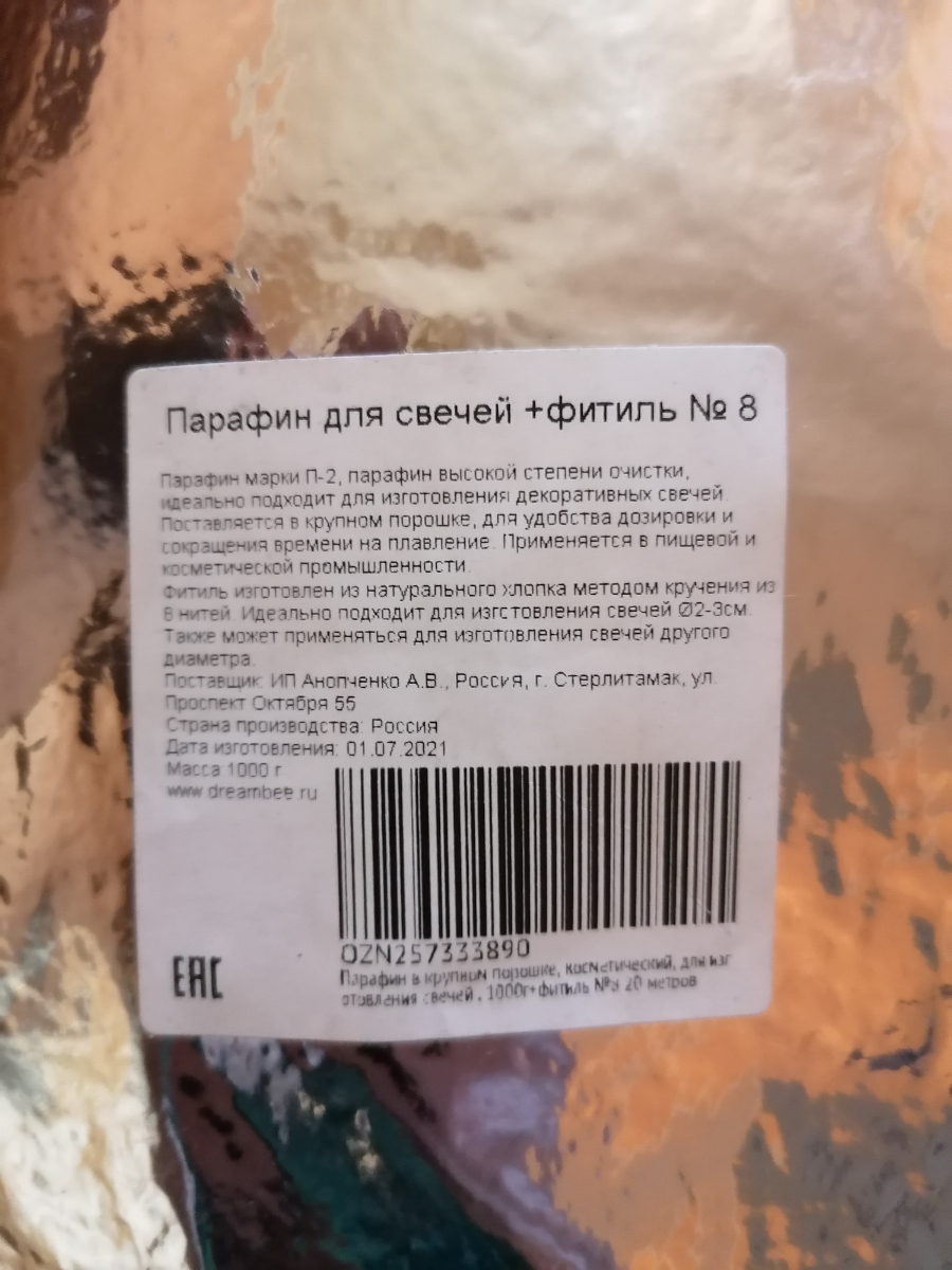 Парафин в крупном порошке, косметический, для изготовления свечей , 1000г+фитиль №8 20 метров