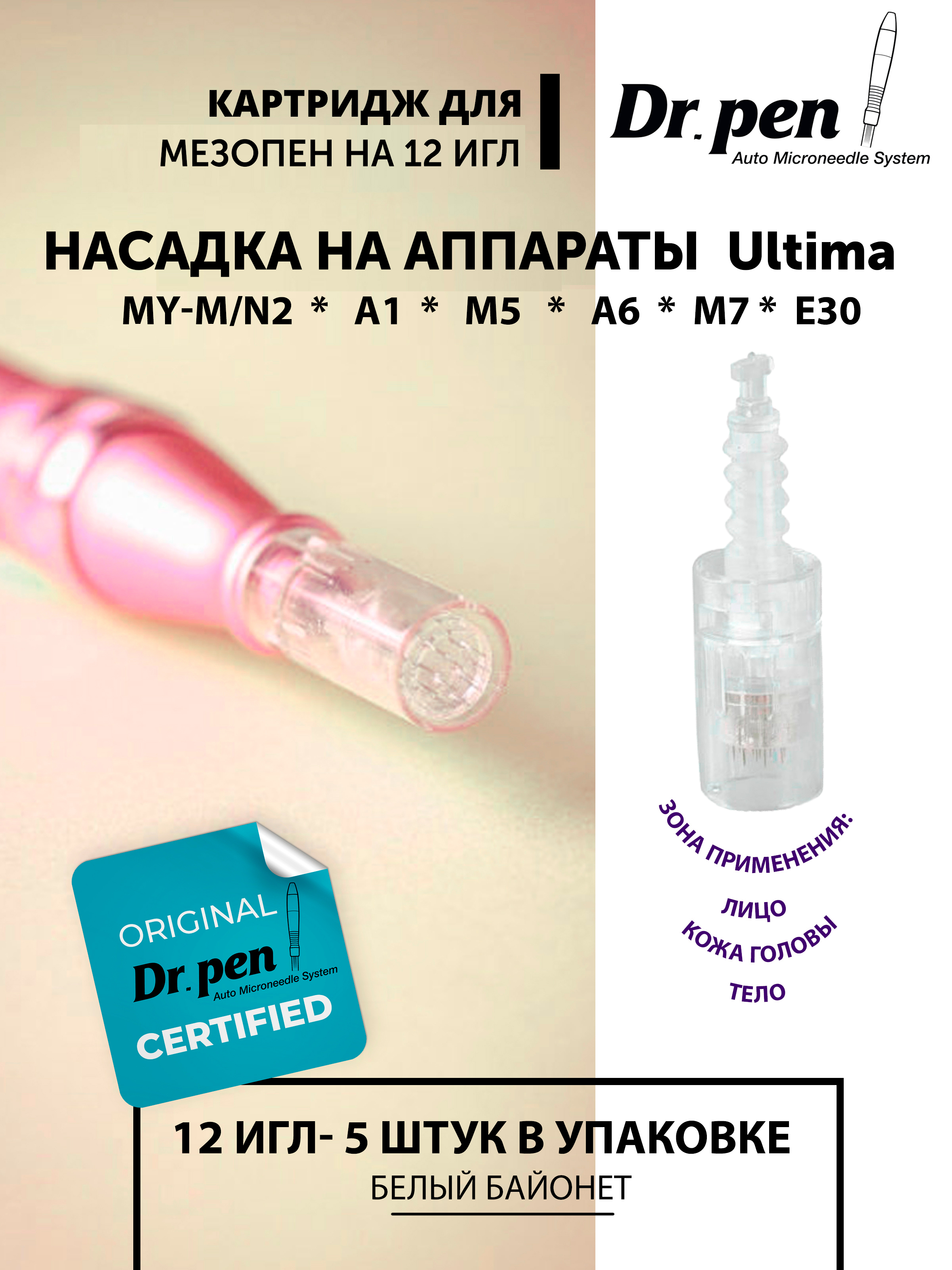 Dr.pen Мезотерапия Картридж для дермапен / мезопен на 12 игл, насадка на dermapen My-M/А1/N2/M5/А6/М7/E30, белый Bayonet, 5 шт.
