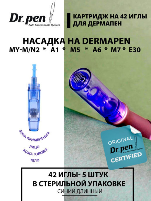 Dr.pen Мезотерапия Картридж для дермапен на 42 иглы, насадка на dermapen My-M/А1/N2/M5/А6/М7/E30, синий длинный, 5 шт.