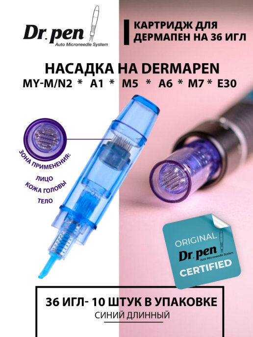 Dr.pen Мезотерапия Картридж для дермапен на 36 игл,насадка на dermapen My-M/А1/N2/M5/А6/М7/E30, синий длинный, 10 шт.