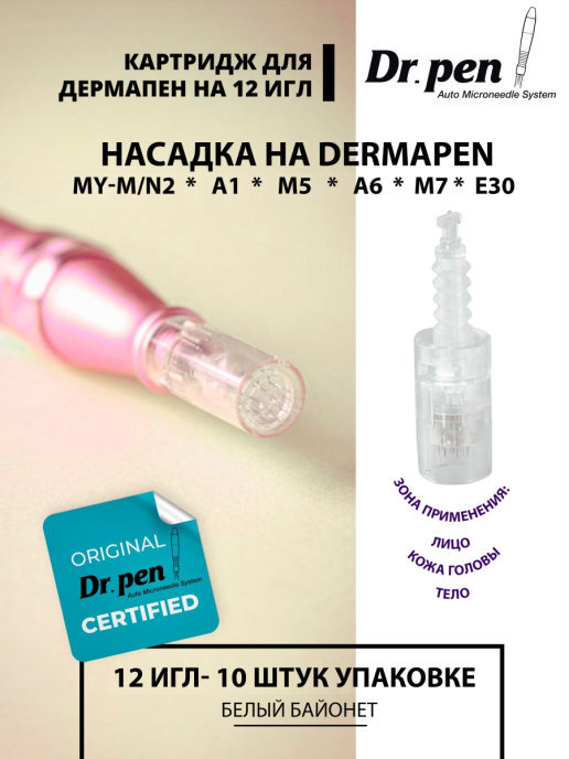 Dr.pen Мезотерапия Картридж для дермапен на 12 игл, насадка на dermapen My-M/А1/N2/M5/А6/М7/E30, белый Bayonet, 10 шт.