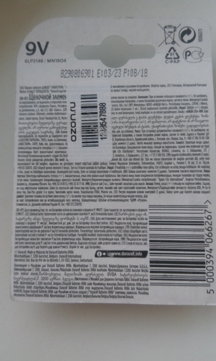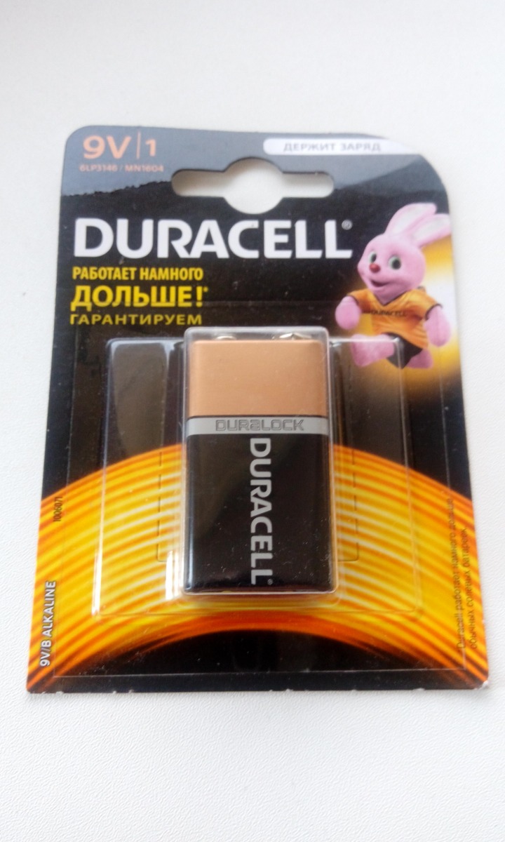 Батарейки щелочные (алкалиновые) Duracell Basic, тип "Крона" (6LR61), 9В, 1шт