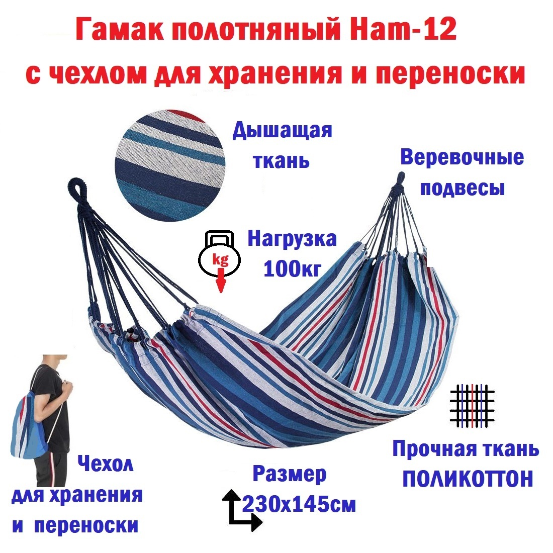 Гамак полотняный Ecos Ham с чехлом для хранения и переноски 230х145 см