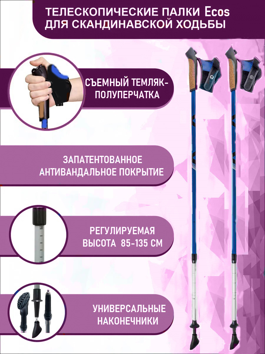 Палки для скандинавской ходьбы ECOS Nordic регулируемые 85-135см, двухсекционные, алюминиевые, 1пара
