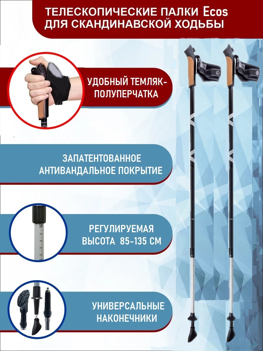 Палки для скандинавской ходьбы ECOS Nordic регулируемые 85-135см, двухсекционные, алюминиевые, 1пара