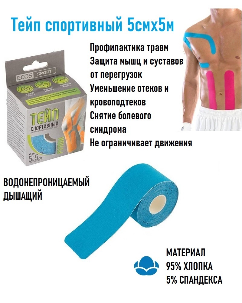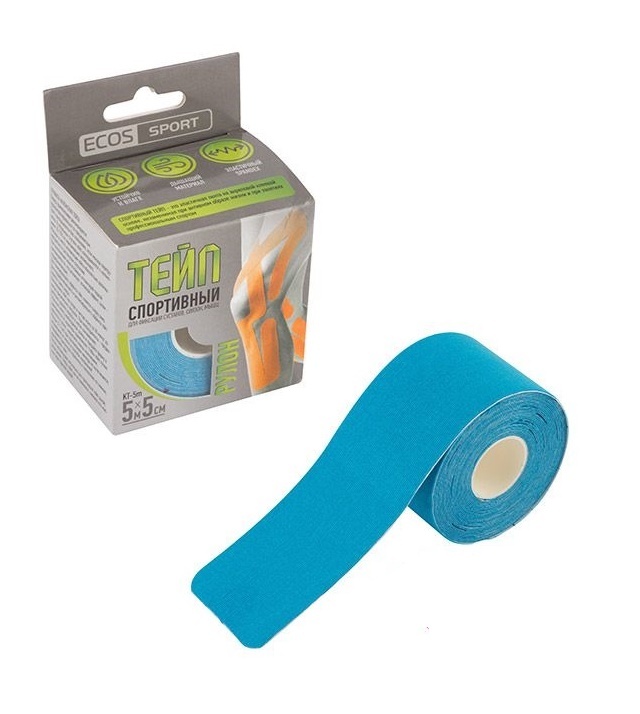 Атлетический тейп, Кинезиотейп Ecos Bandage KT-5m, 5 метров в рулоне 5см Х 5 м, голубой