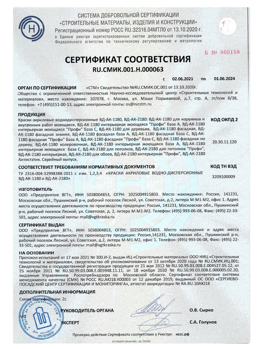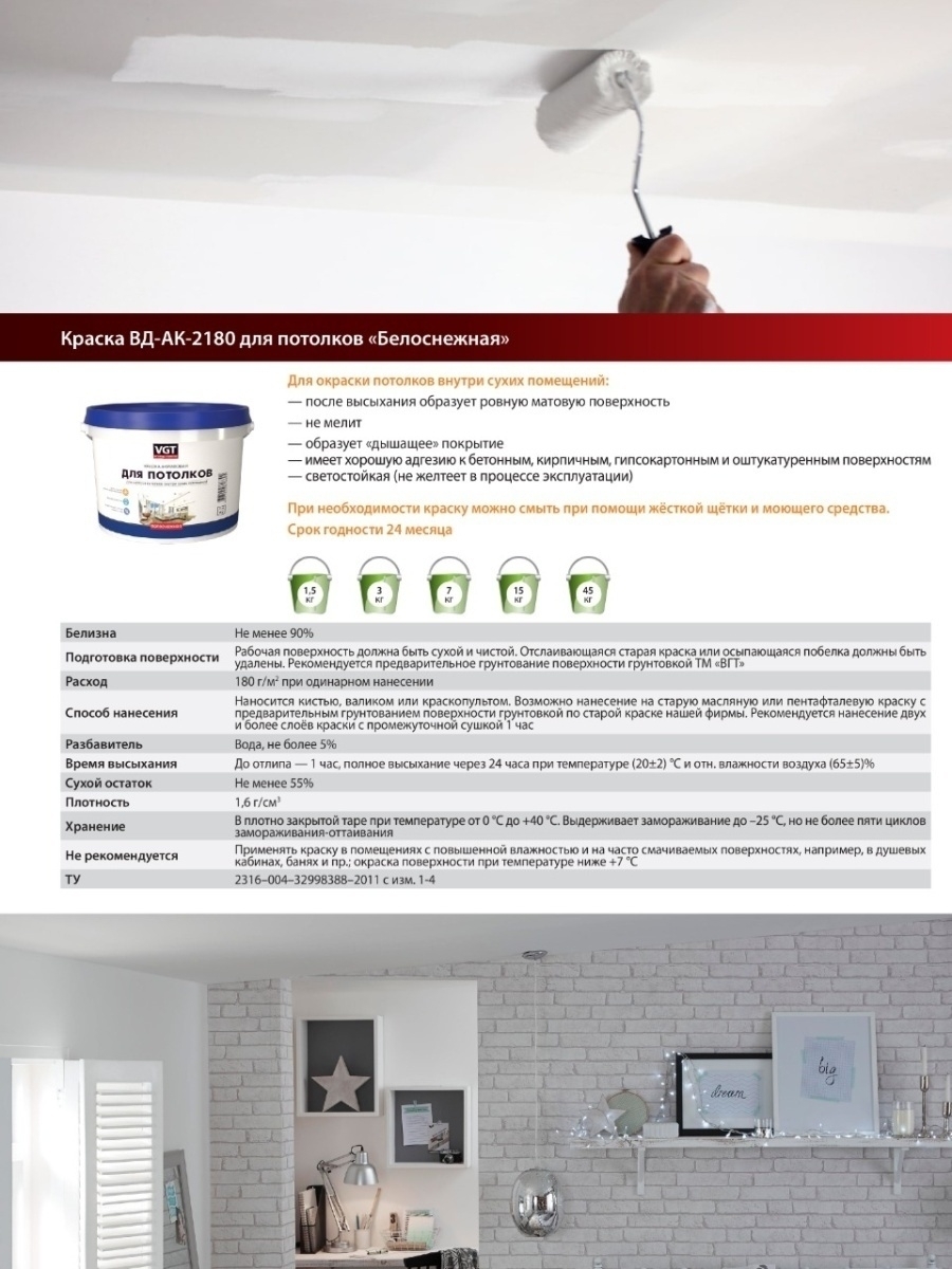VGT Краска (эмаль) акриловая ВД-АК-2180 для потолков, белоснежная, 1,5 кг