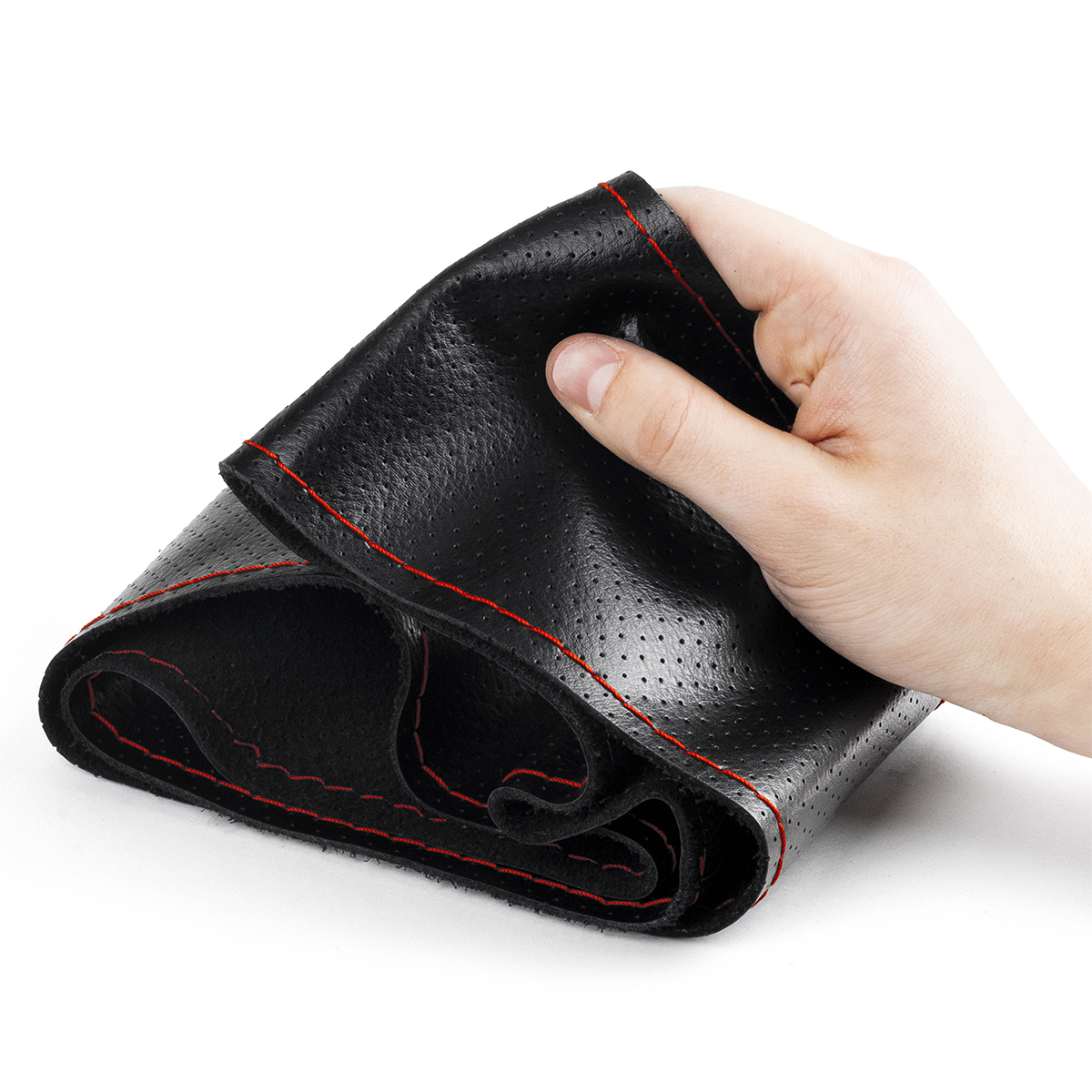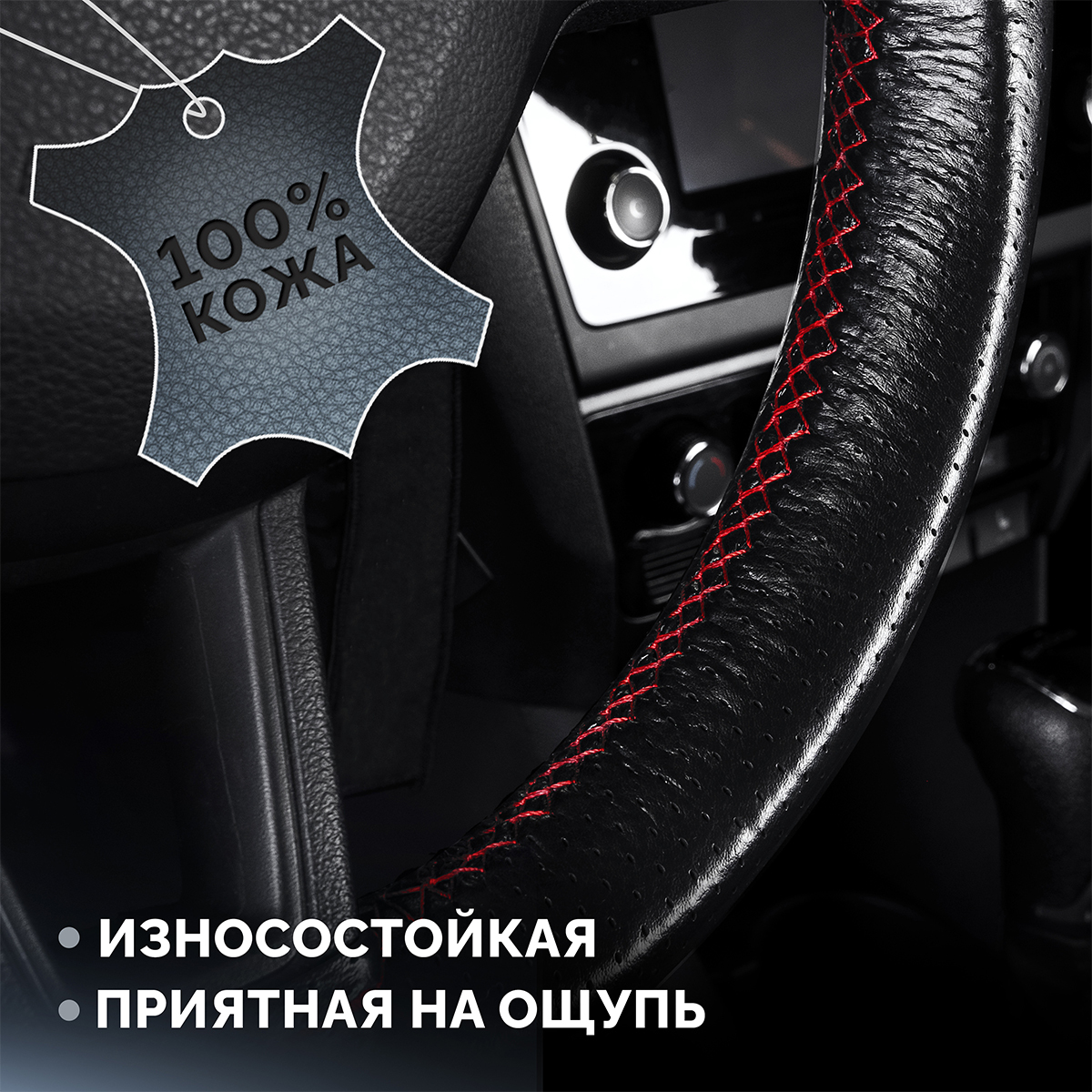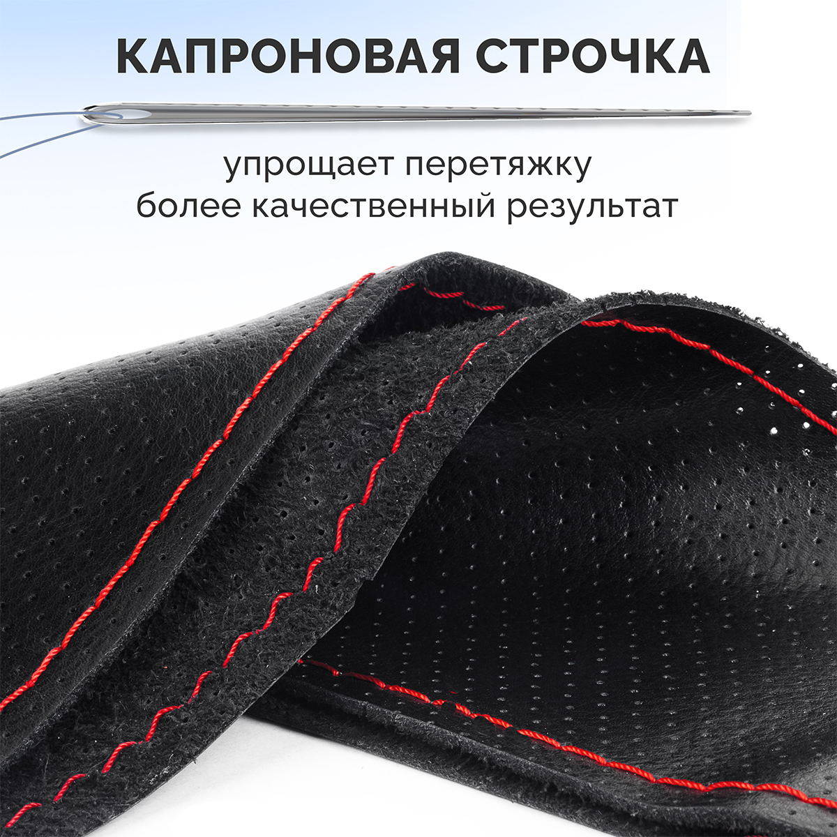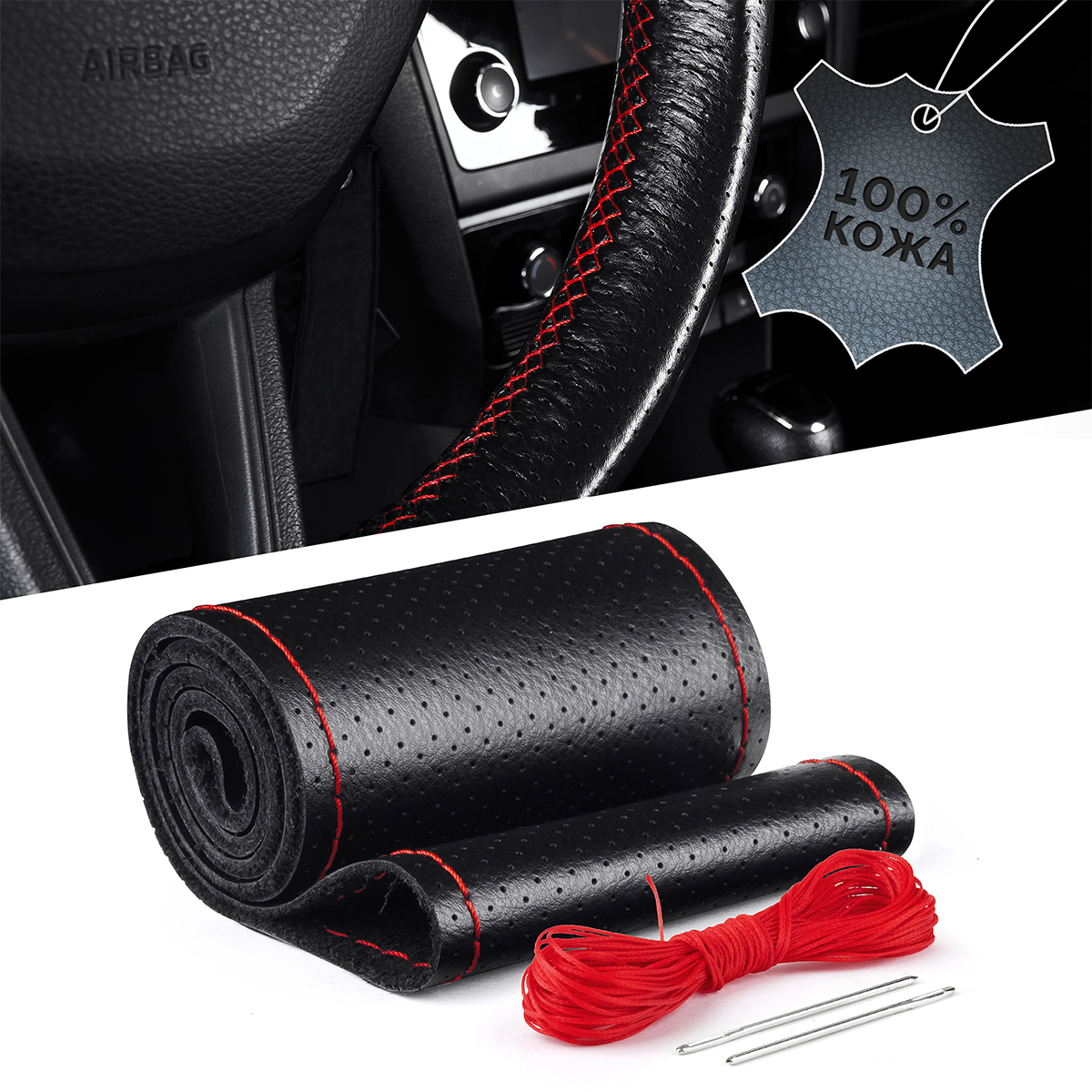 Оплетка на руль на шнуровке с перфорацией натуральная кожа черная с красной нитью
