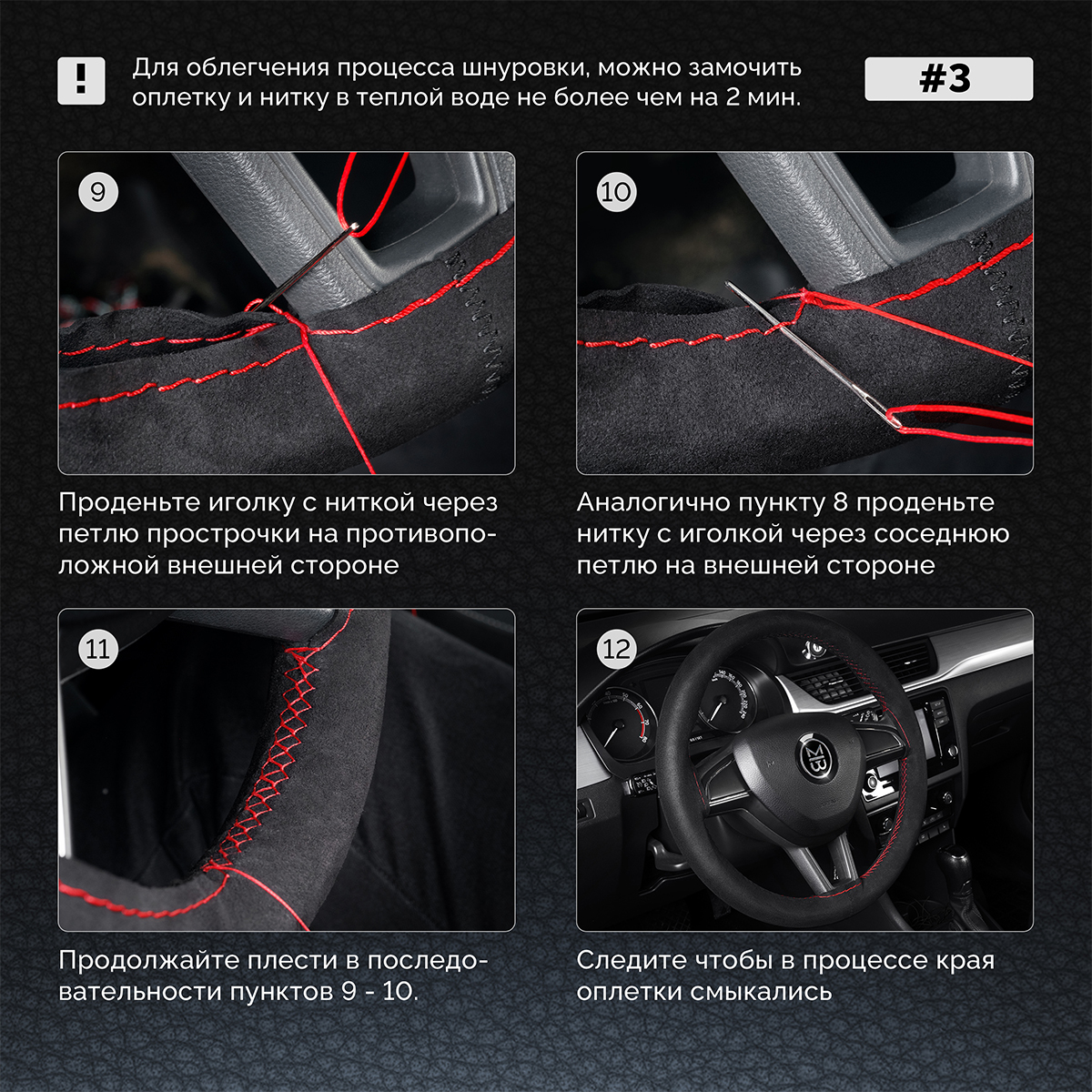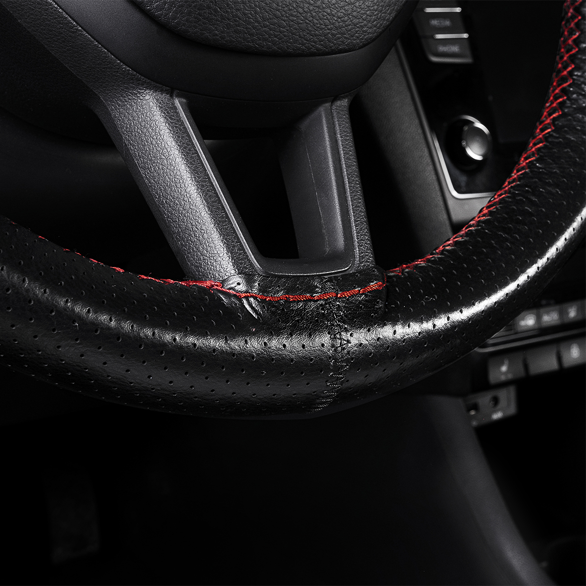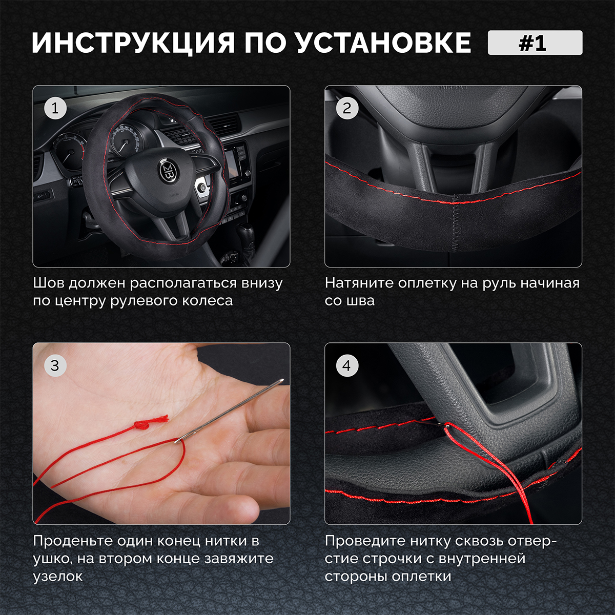 Оплетка на руль на шнуровке с перфорацией натуральная кожа черная с красной нитью