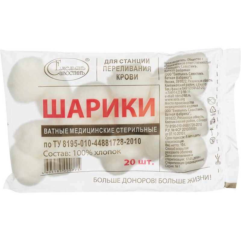Перевяз. ср-ва Ватные шарики стерил. 10 гр. №20 Емельянъ Савостинъ 3 уп.