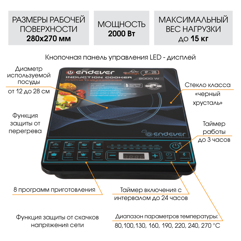 Индукционная Настольная плита Endever IP-28, 8 автоматических программ, черный