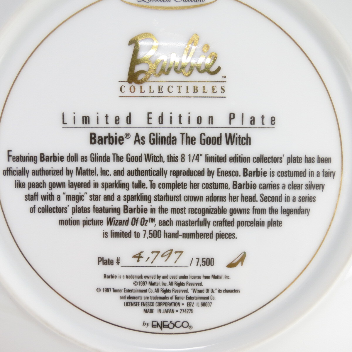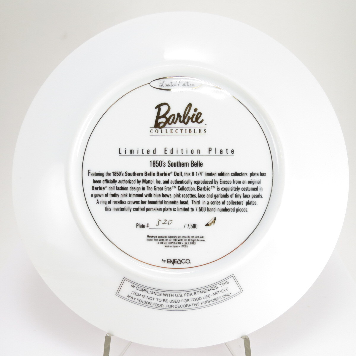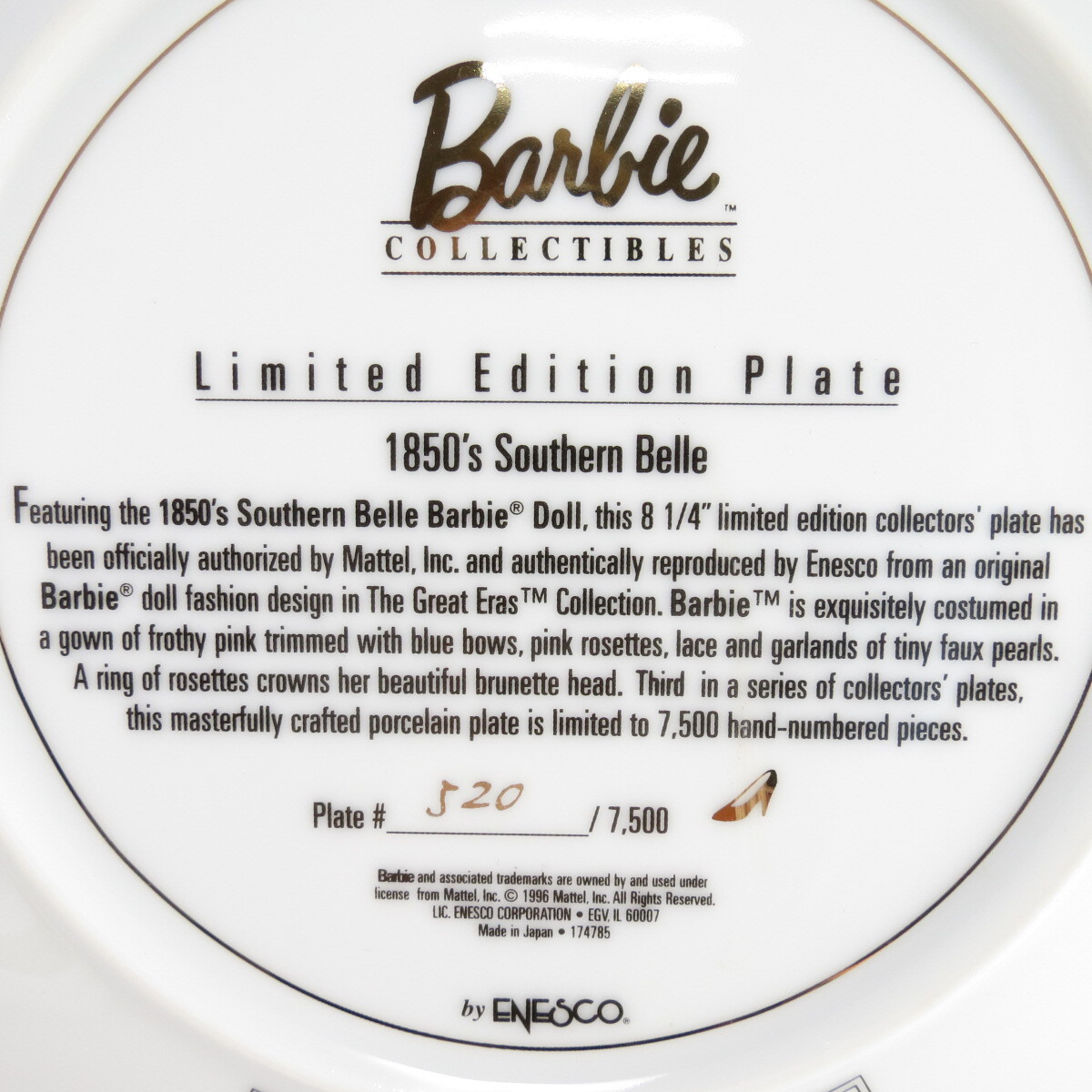 Декоративная коллекционная тарелка "Коллекция кукол Барби: Южная красавица Барби 1850-х годов". Фарфор, деколь, золочение. Япония, Enesco Corporation, 1996