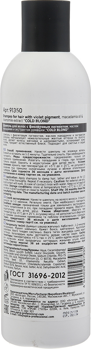 Epica Professional Шампунь для волос Cold Blond, для нейтрализации желтого оттенка, 300 мл