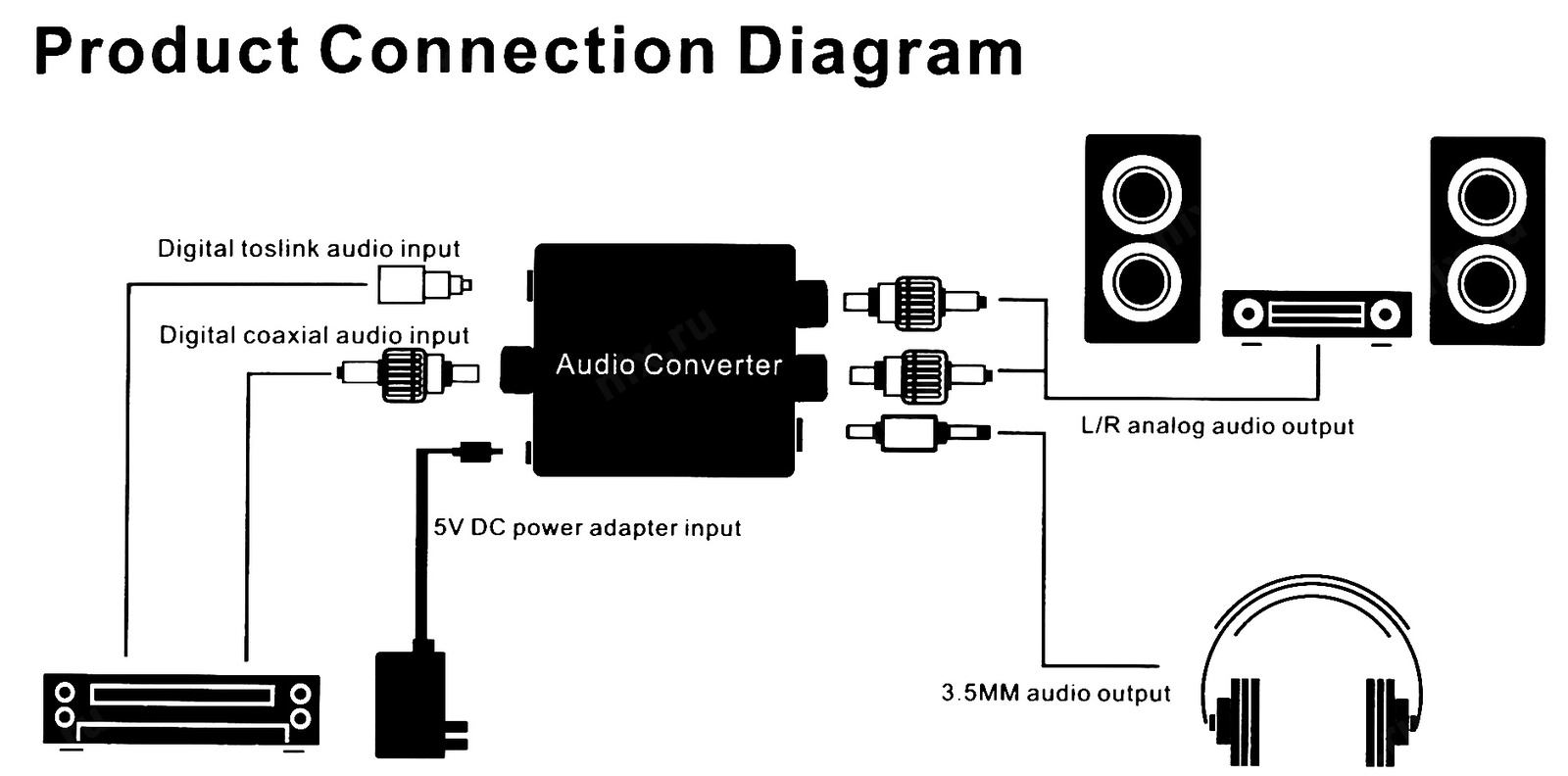 Аудио конвертер Espada EDH-TR/R, 1xToslink + 1RCA(Coaxil) to 2x RCA (analog), черный