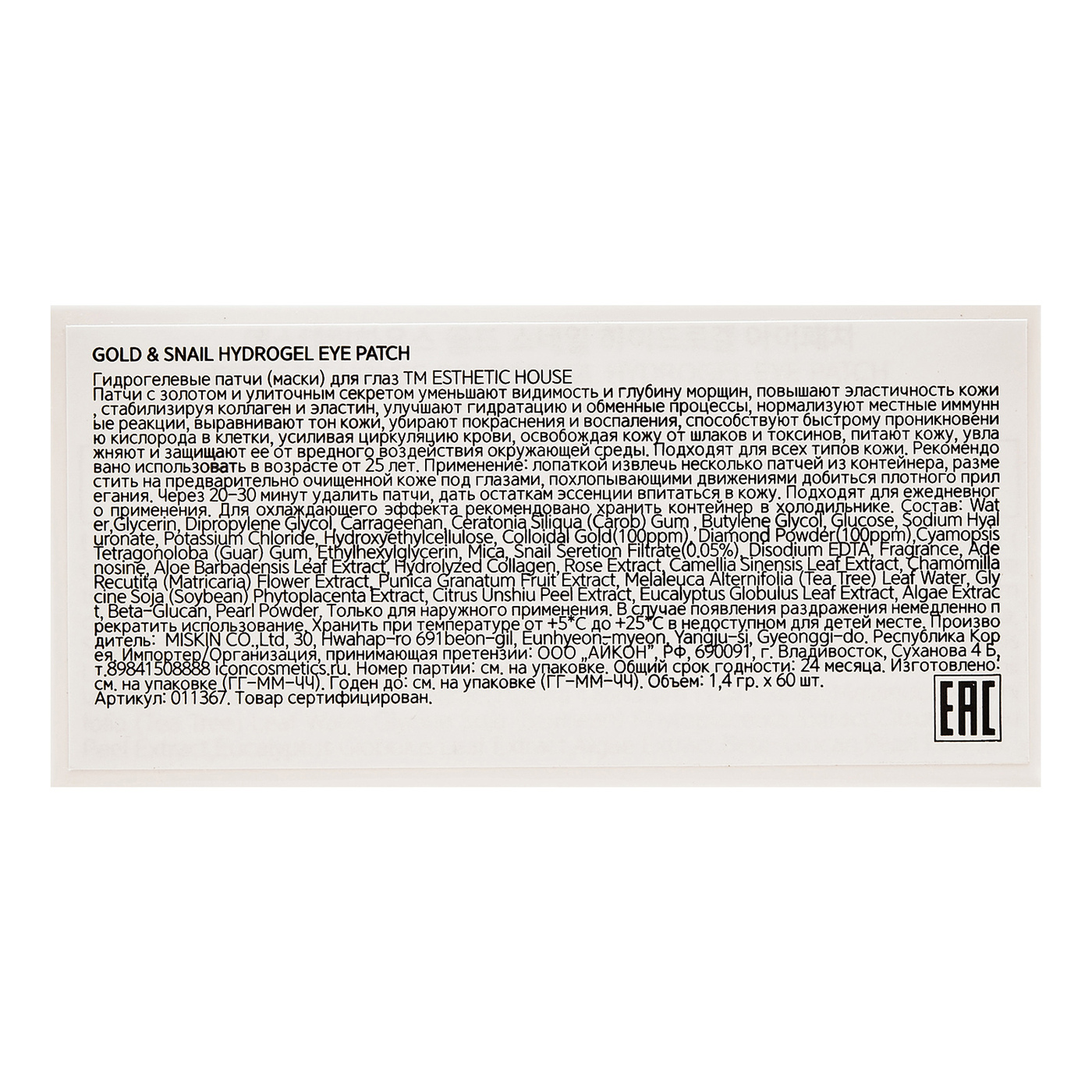 ESTHETIC HOUSE Увлажняющие патчи для глаз Gold&Snail Hydrogel, 60 шт