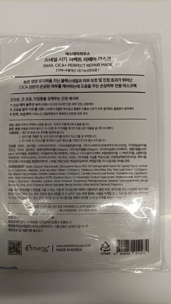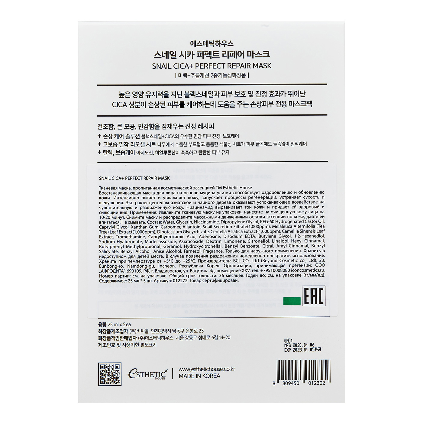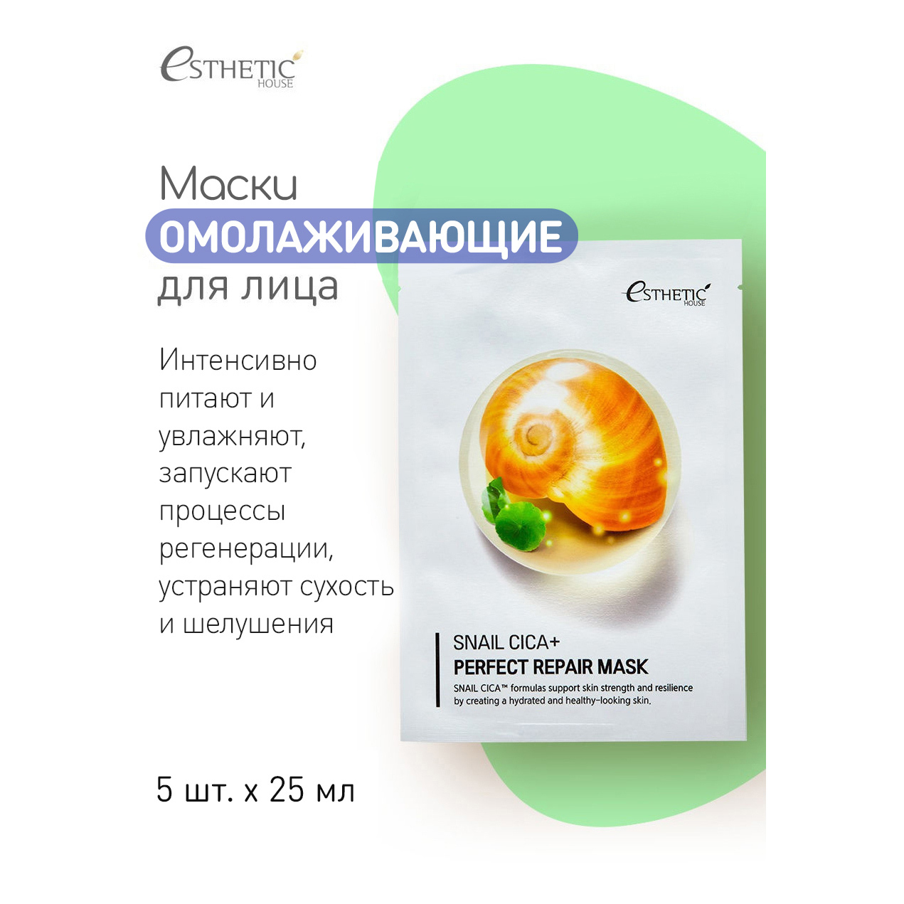 ESTHETIC HOUSE Набор питательных корейских масок для лица тканевых Snail Cica+ Perfect Repair Mask (МУЦИН УЛИТКИ)- 25 мл* 5 шт. Уцененный товар