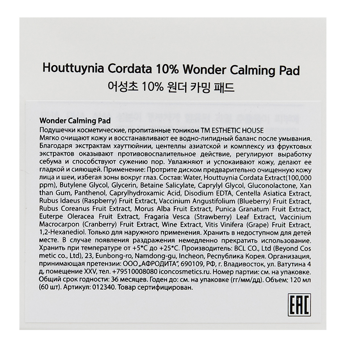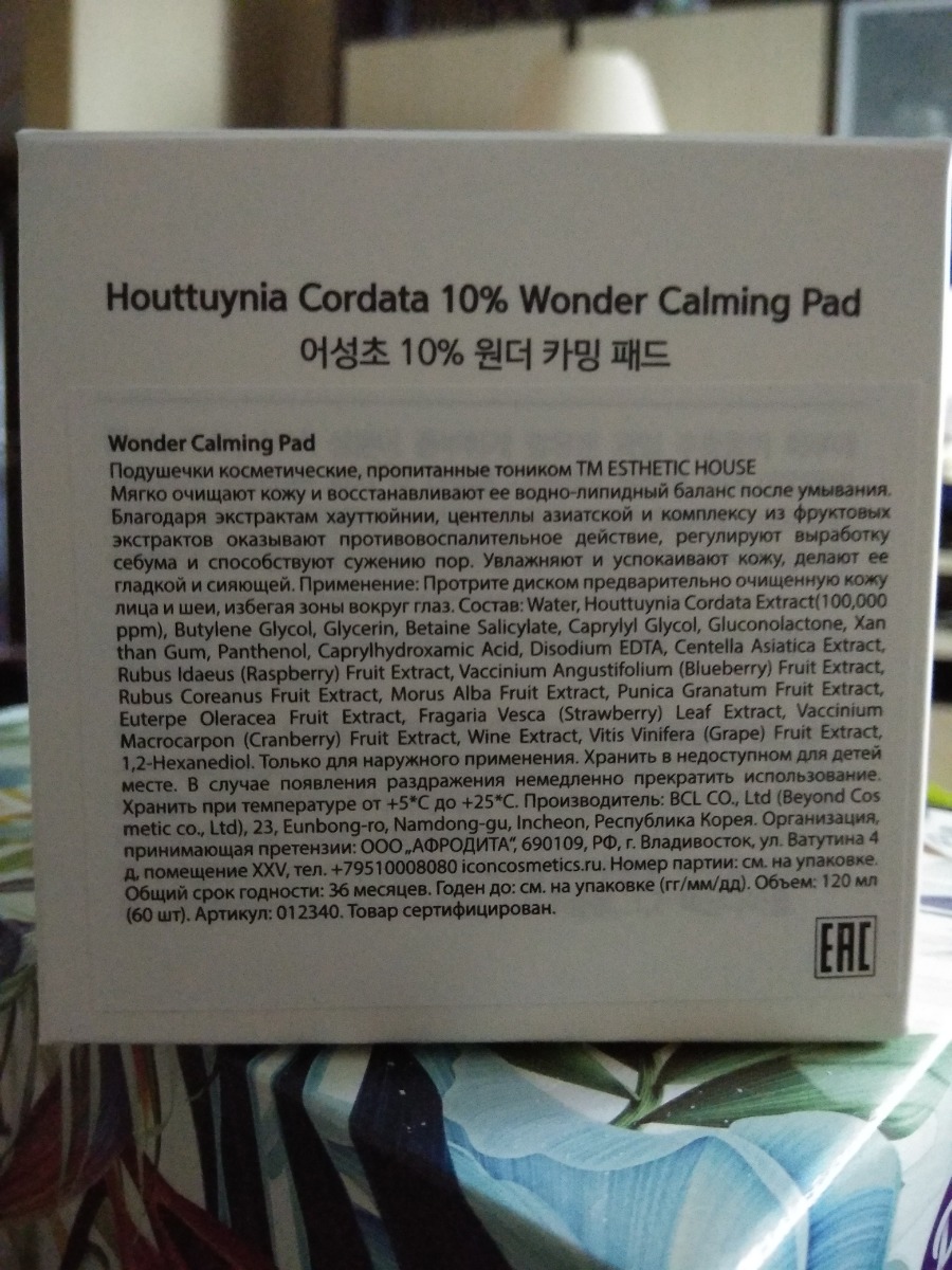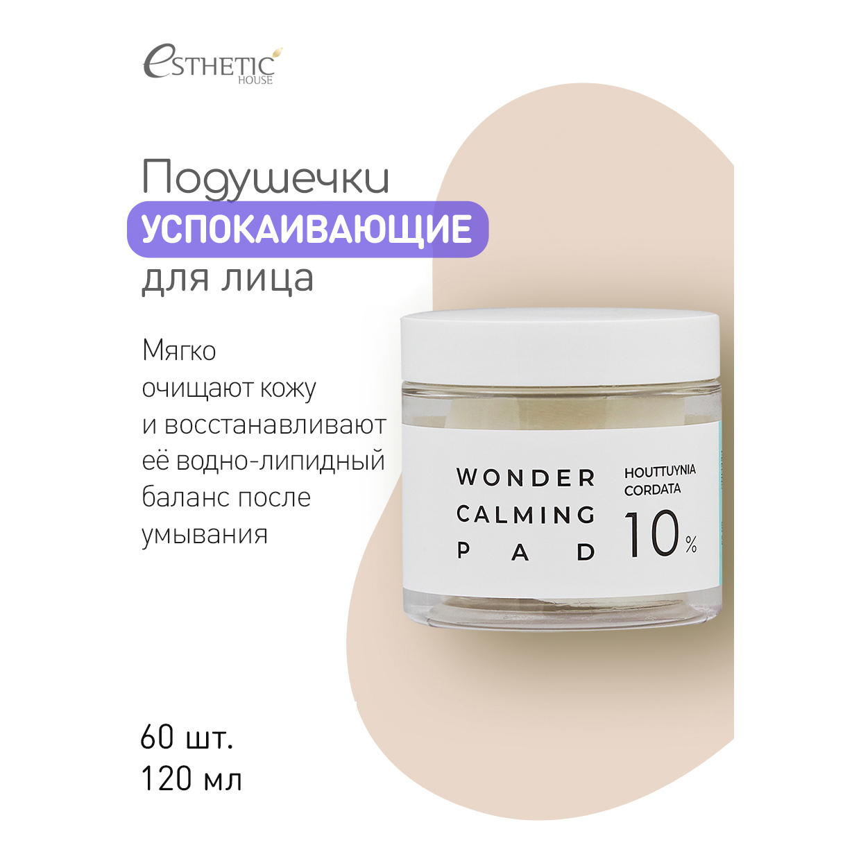 ESTHETIC HOUSE Набор увлажнающих косметических подушечек для лица пропитанных тоником, Корея, Wonder Calming Pad, 120 мл, 60 шт