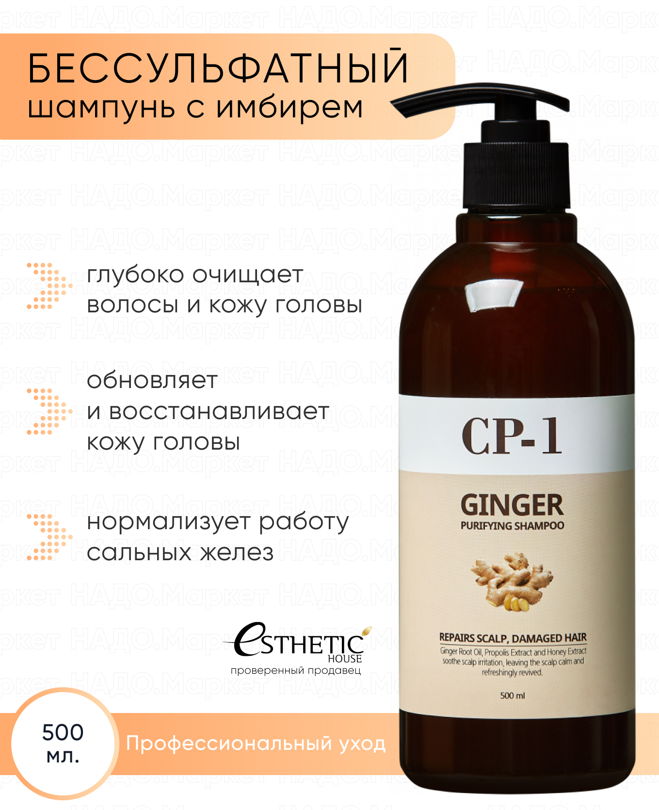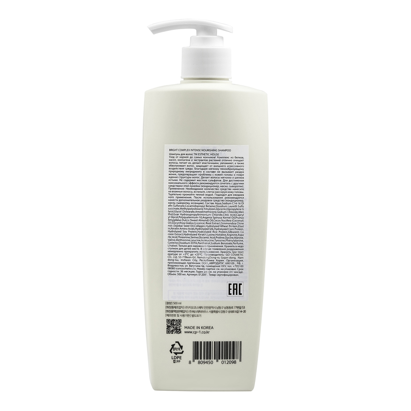ESTHETIC HOUSE Женский корейский шампунь для ежедневного использования, бессульфатный, протеиновый CP-1 BC Intense Nourishing Version 2.0, 500 мл