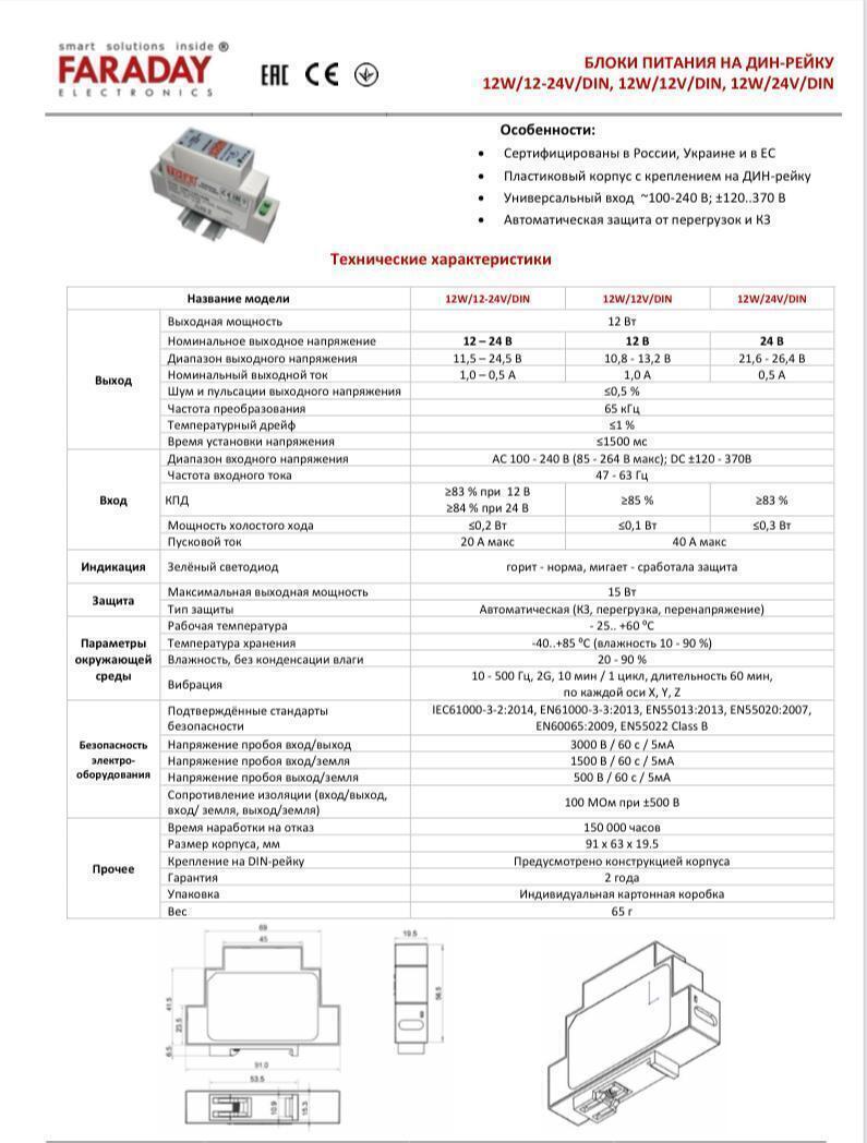 12W/12-24V/DIN импульсный блок питания на DIN-рейку (модульный) Faraday