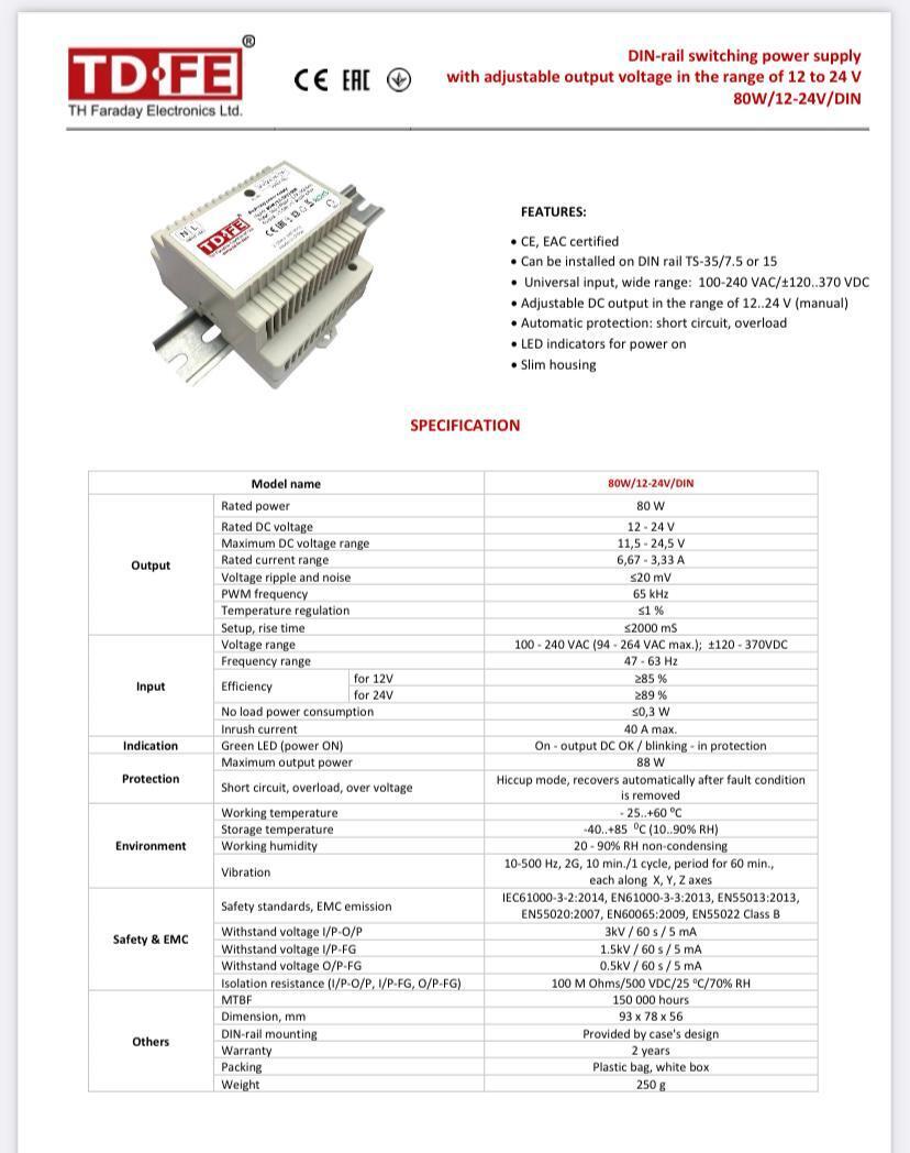Модульный блок питания на DIN-рейку 80W, 12-24V
