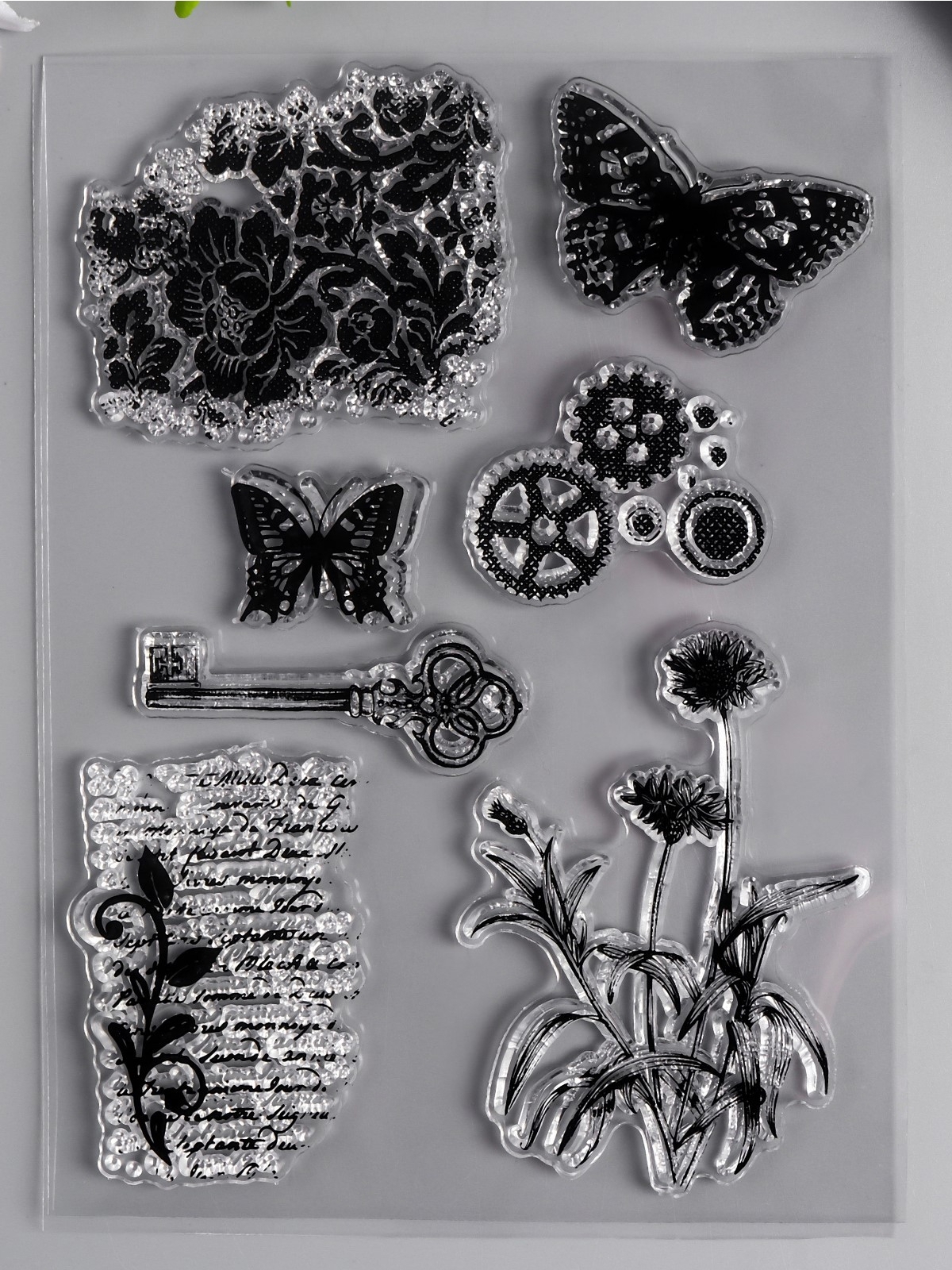 FEYT, Штамп силиконовый "Бабочки, цветы и ключ" для творчества, для скрапбукинга