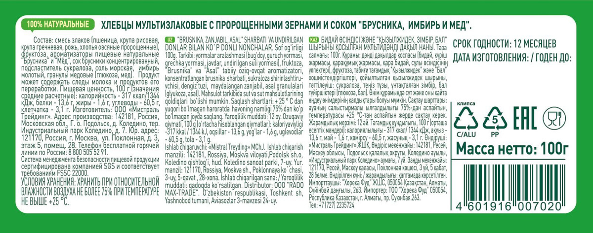 Fitstart Хлебцы мультизлаковые брусника имбирь и мед, 100 г