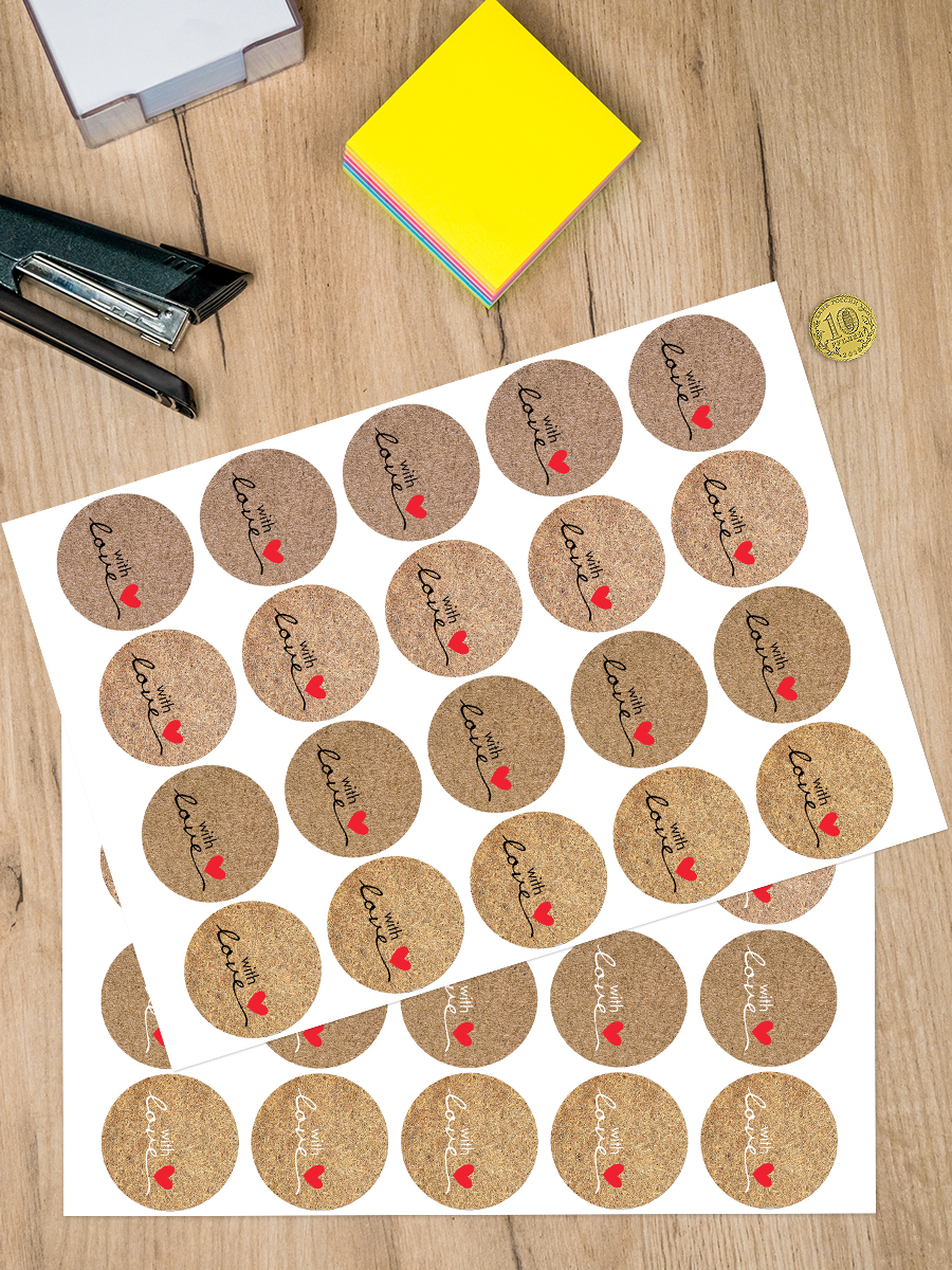 Самоклеящиеся круглые этикетки With Love, диаметр 50 мм., 80 шт. в комплекте, формат А4