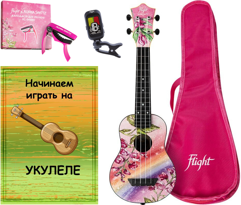 Укулеле Алёна Швец Flight TUS ALYONA SHVETZ с самоучителем, каподастром, тюнером и чехлом