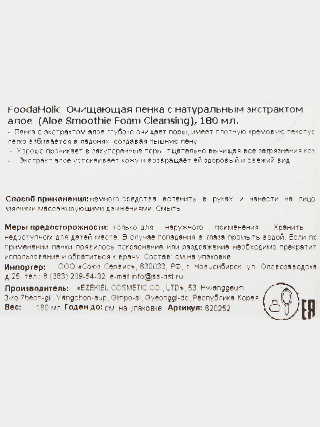FoodaHolic, пенка для умывания с экстрактом алоэ, 180мл.