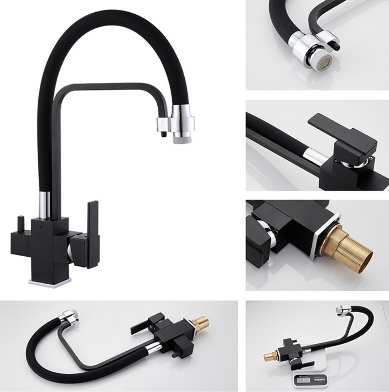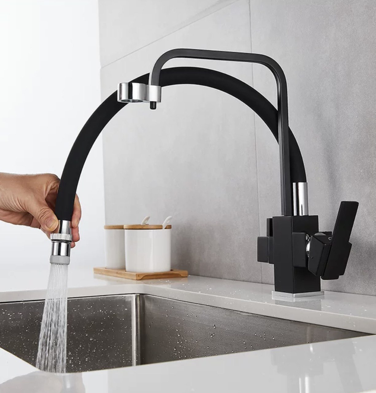 Смеситель для кухни под фильтр и краном для питьевой воды с гибким силиконовым поворотным изливом