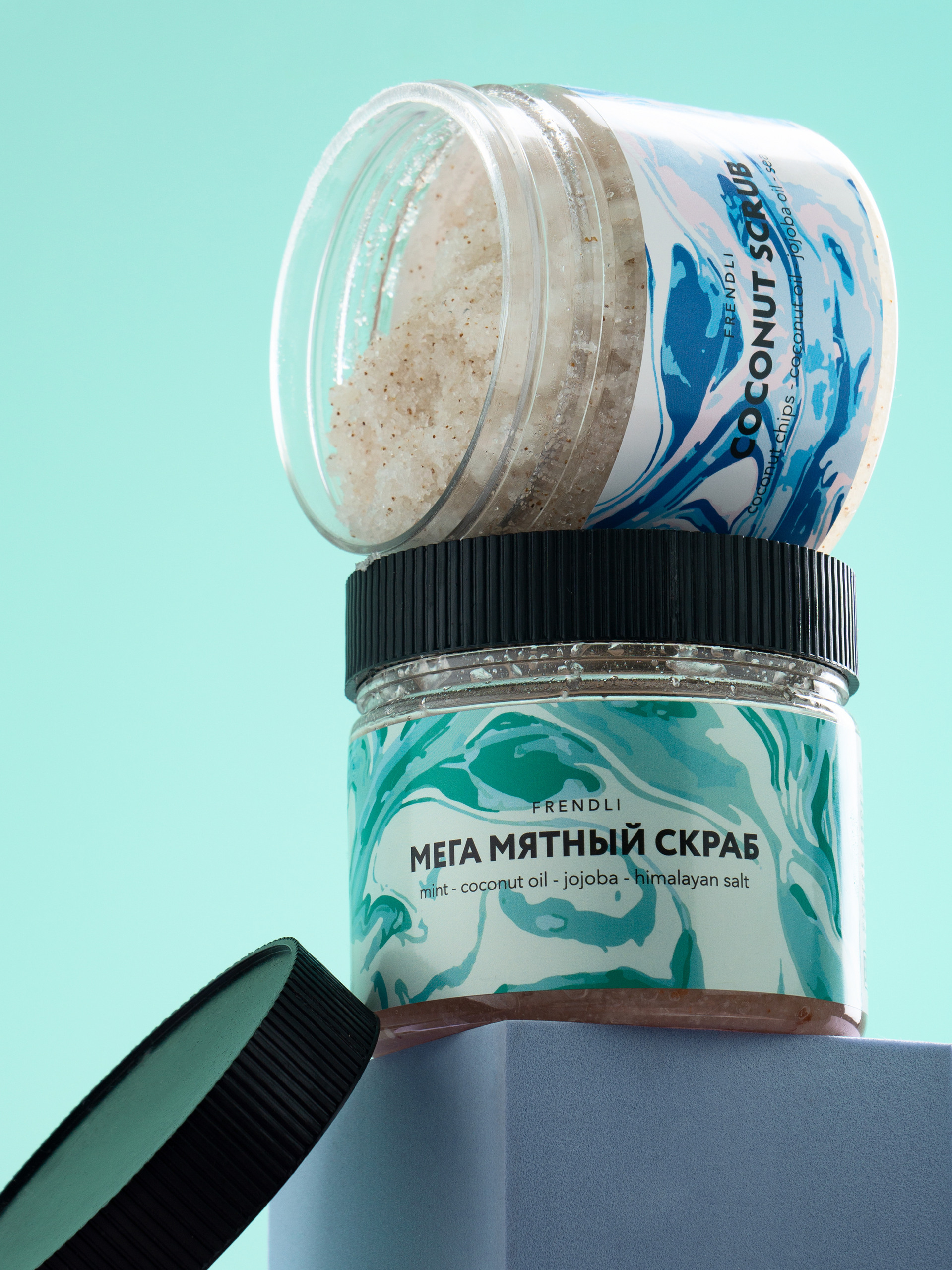 Frendli Подтягивающий Мега Мятный соляной скраб с маслом Жожоба, Макадамии и экстрактом Готу Кола