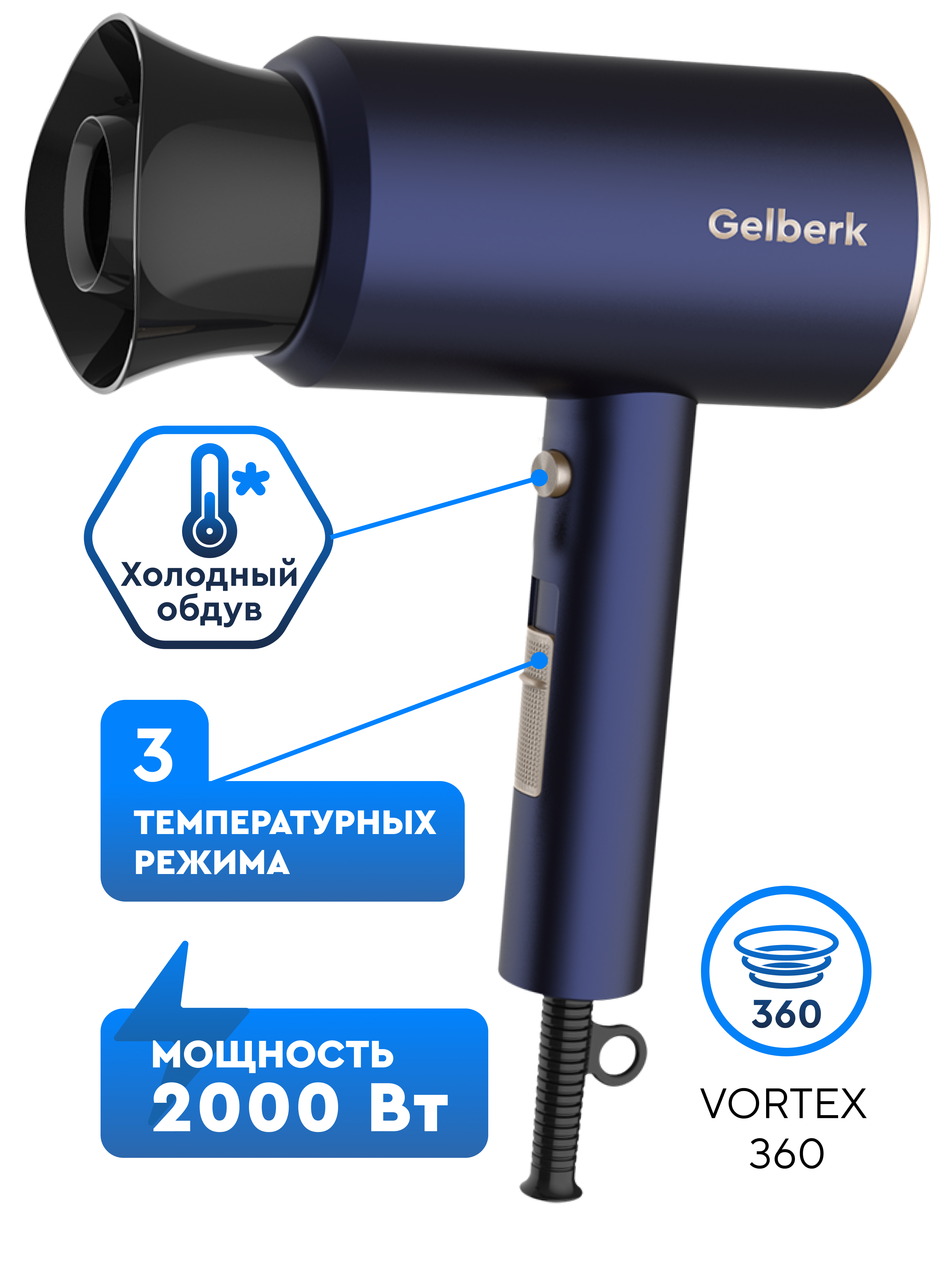 Фен для волос Gelberk GL-D211, темно-синий