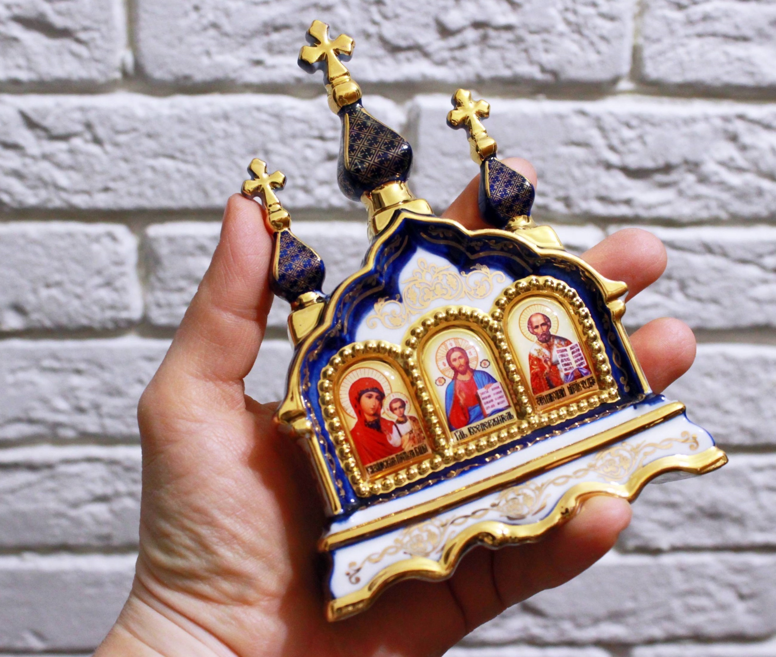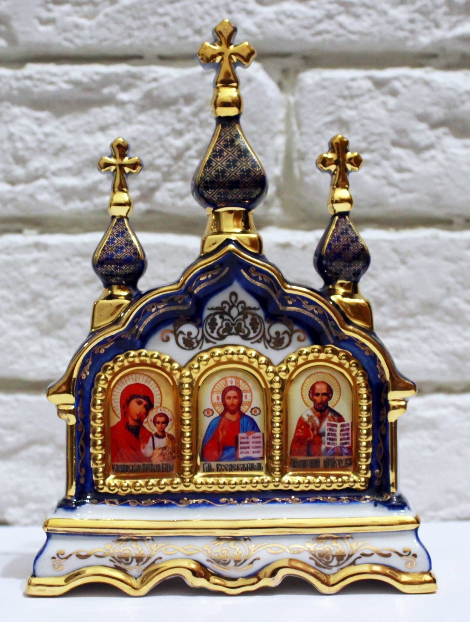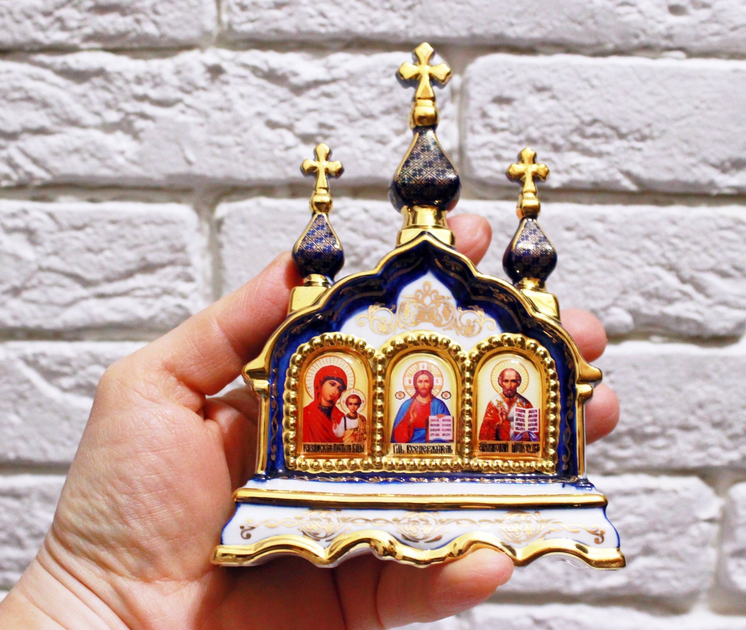 Икона тройная с ликами Святых 14,5 см / Ручная роспись / Гжель