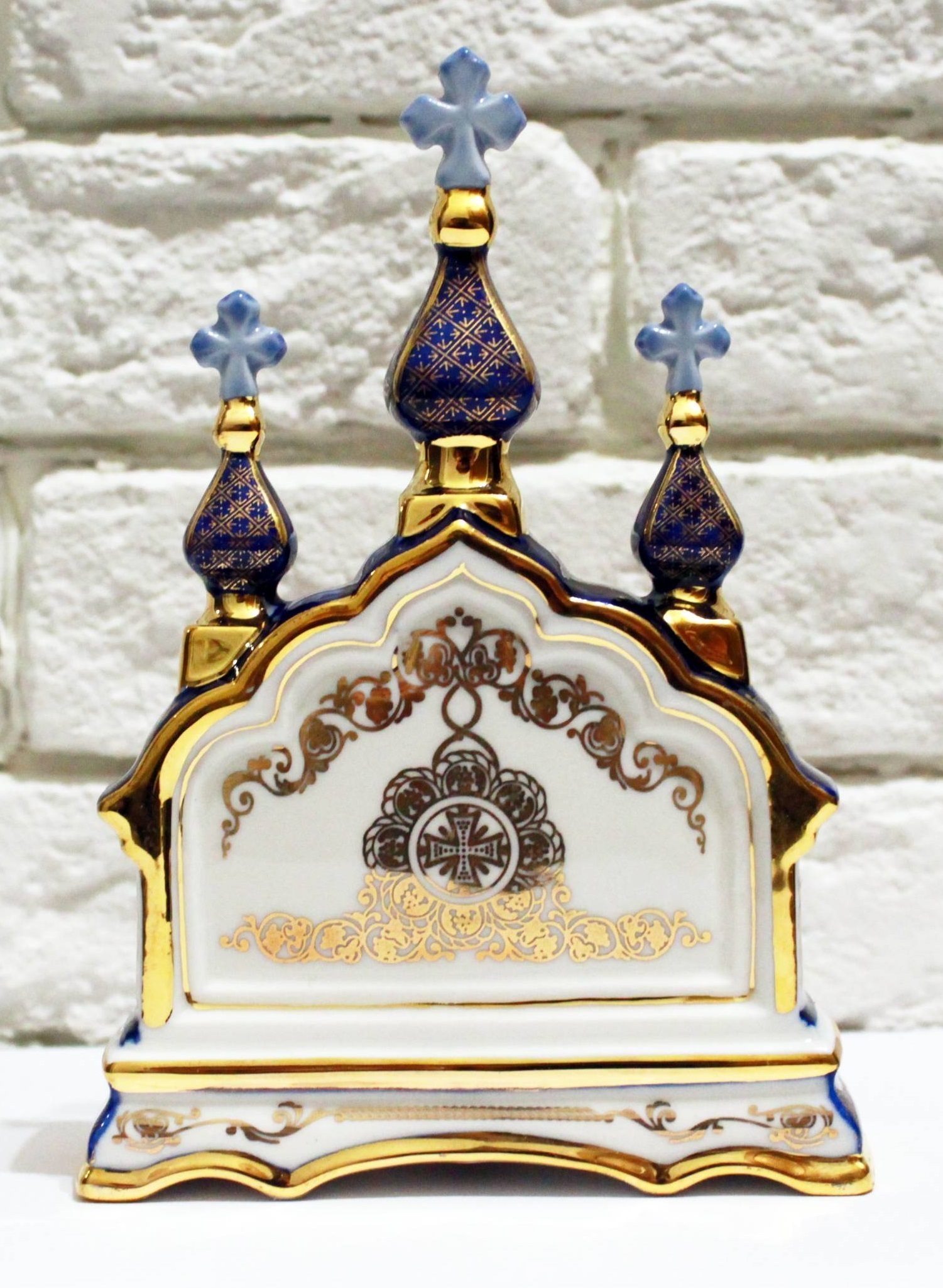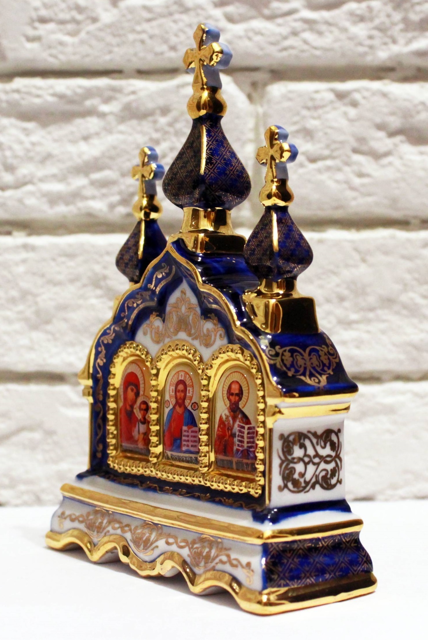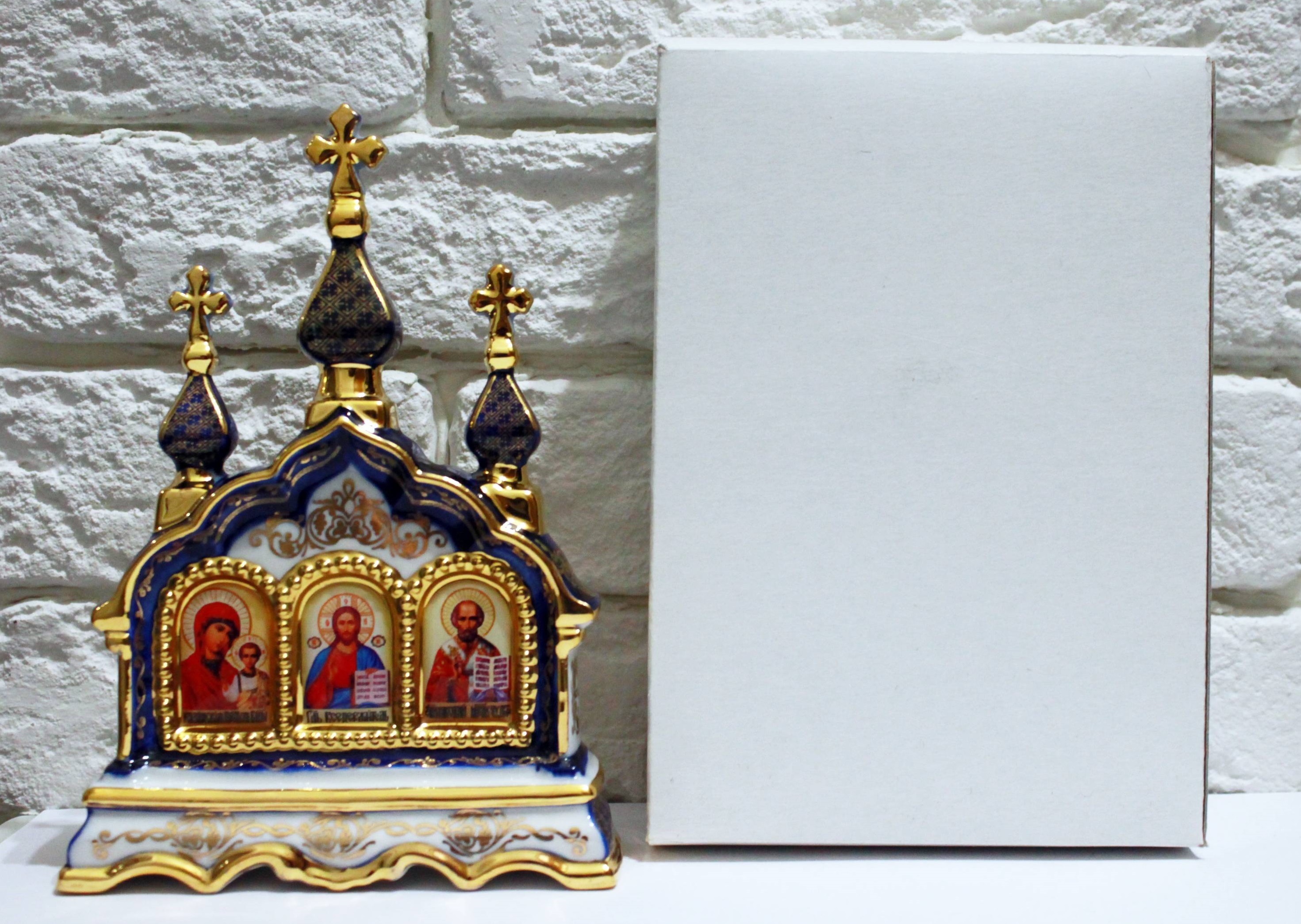 Икона тройная с ликами Святых 14,5 см / Ручная роспись / Гжель
