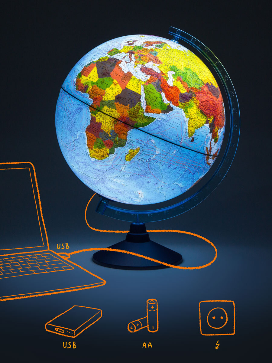 Globen Глобус Земли политический рельефный с LED-подсветкой, диаметр 25 см.